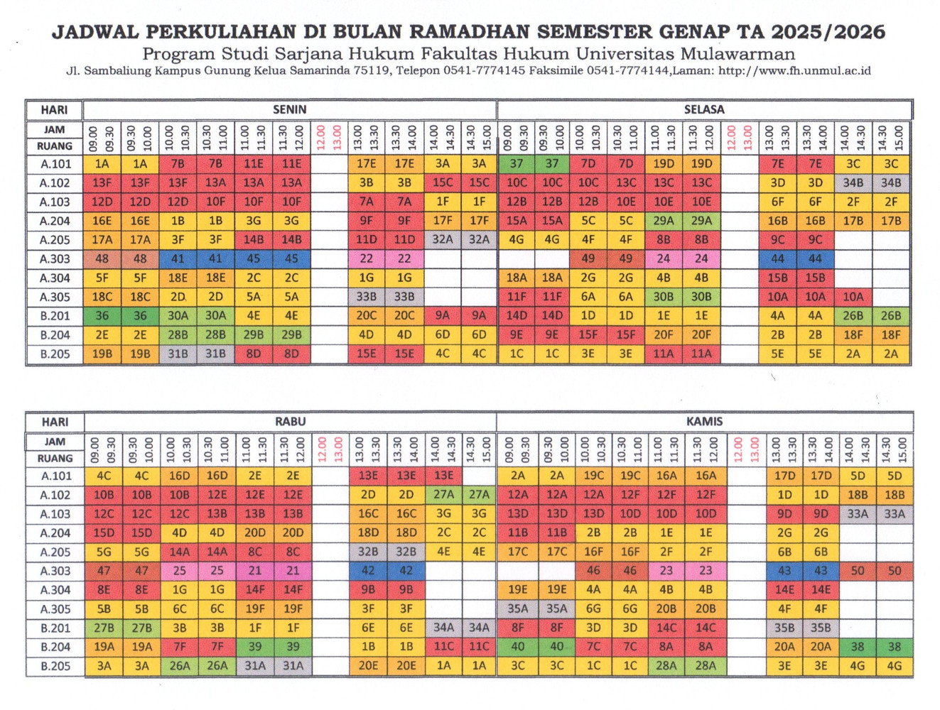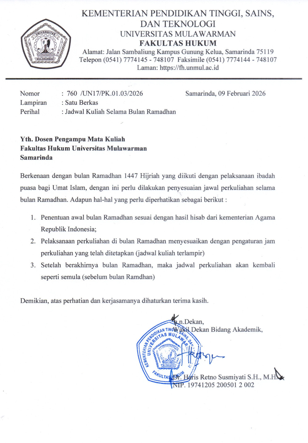 Berkenaan dengan bulan Ramadhan 1447H yang diikuti dengan pelaksanaan ibadah puasa bagi Umat Islam, dengan ini perlu dilakukan penyesuaian jadwal perkuliahan selama bulan Ramadhan.