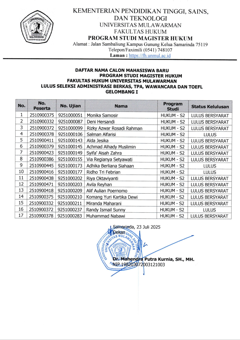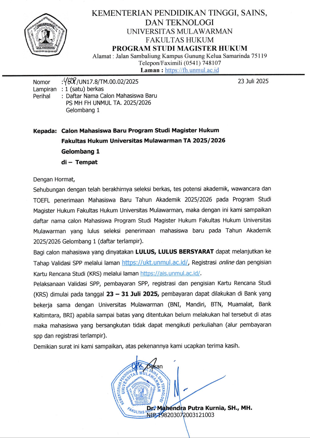 Sehubungan dengan berakhirnya seleksi berkas, tes potensi akademik, wawancara dan TOEFL penerimaan Mahasiswa Baru Tahun Akademik 2025/2026 pada Program Studi Magister Hukum Fakultas Hukum Universitas Mulawarman Gelombang 1, maka dengan ini kami sampaikan daftar nama calon Mahasiswa yang lulus seleksi Tahun Akademik 2025/2026 Gelombang 1.