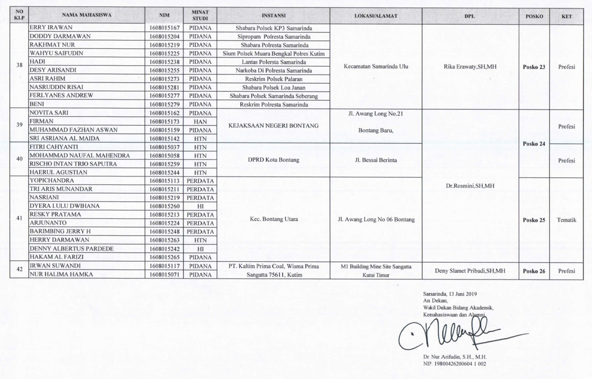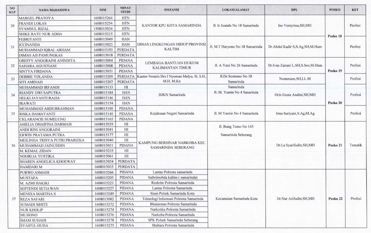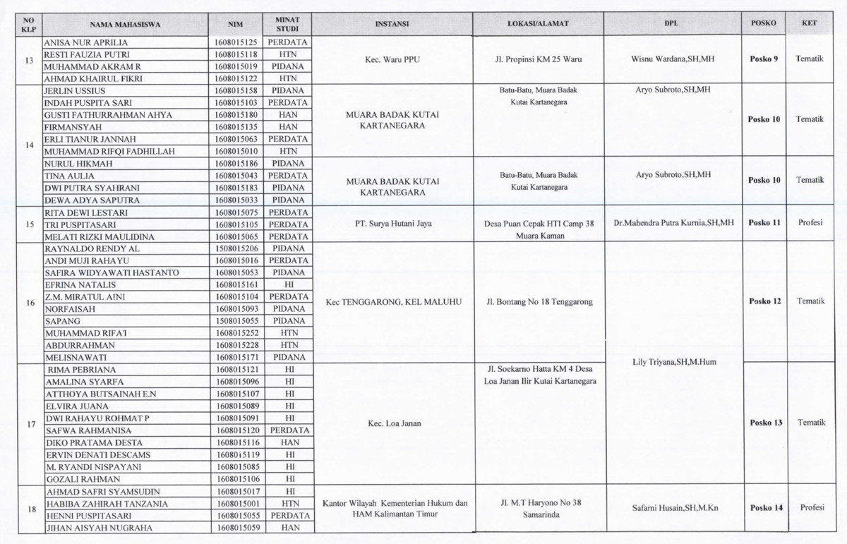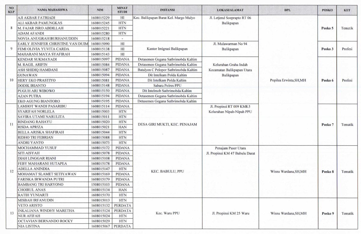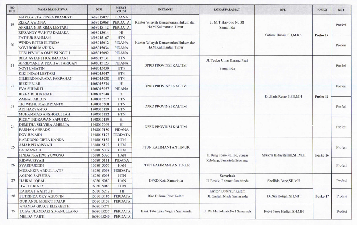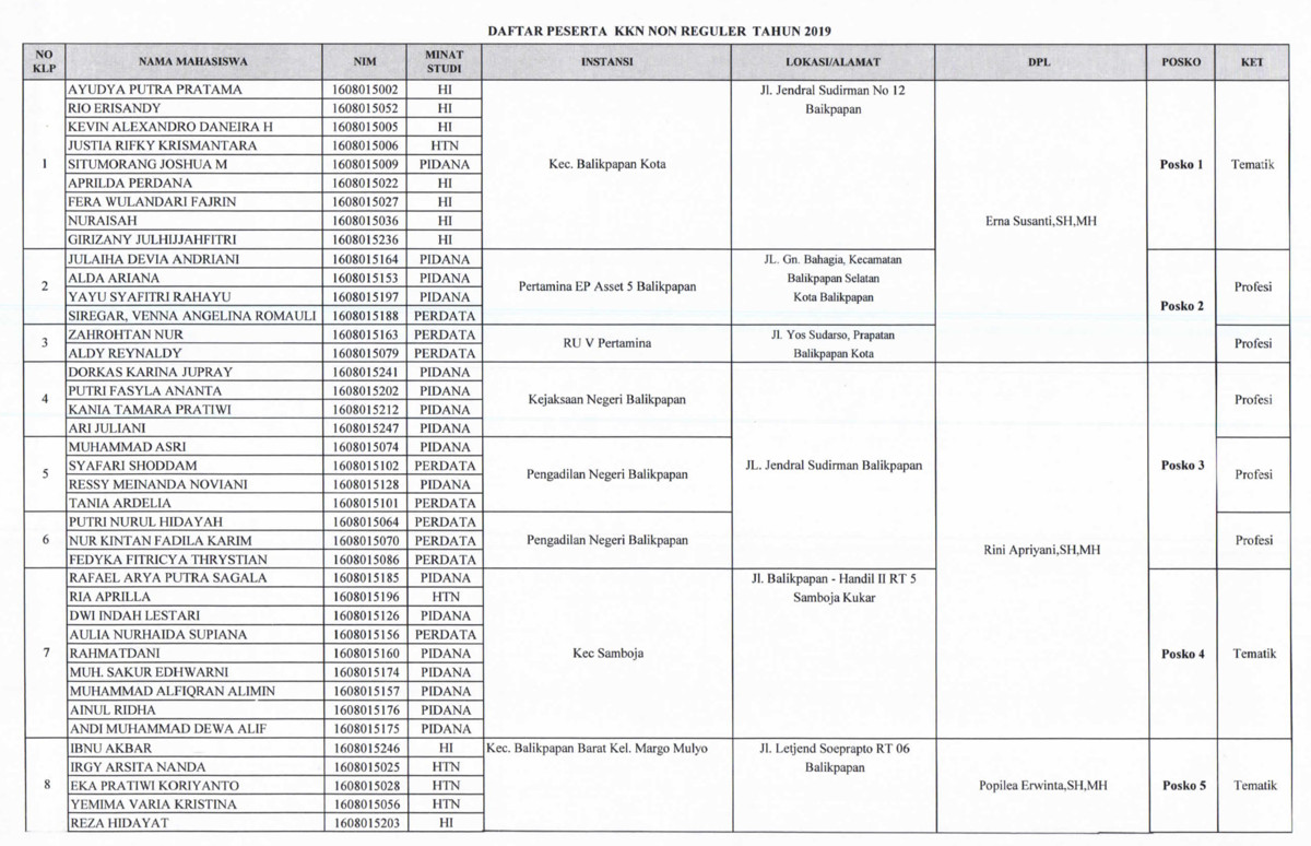 Diinformasikan daftar peserta KKN Non Reguler Fakultas Hukum Universitas Mulawarman Tahun 2019. Detail pada surat terlampir.