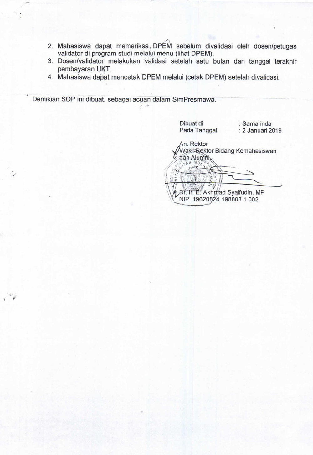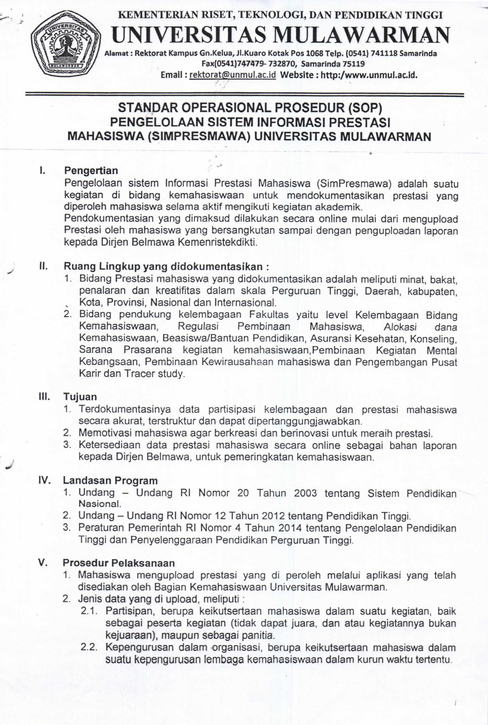 Pengelolaan Sistem Informasi Prestasi Mahasiswa (SimPresmawa) adalah suatu kegiatan bidang kemahasiswaan untuk mendokumentasikan prestasi yang diperoleh mahasiswa selama aktif mengikuti kegiatan akademik. Pendokumentasian yang dimaksud dilakukan secara online mulai dari upload bukti prestasi oleh mahasiswa yang bersangkutan samapai dengan proses upload laporan kepada Dirjen Belmawa Kemenristekdikti. (Detail pada surat terlampir)