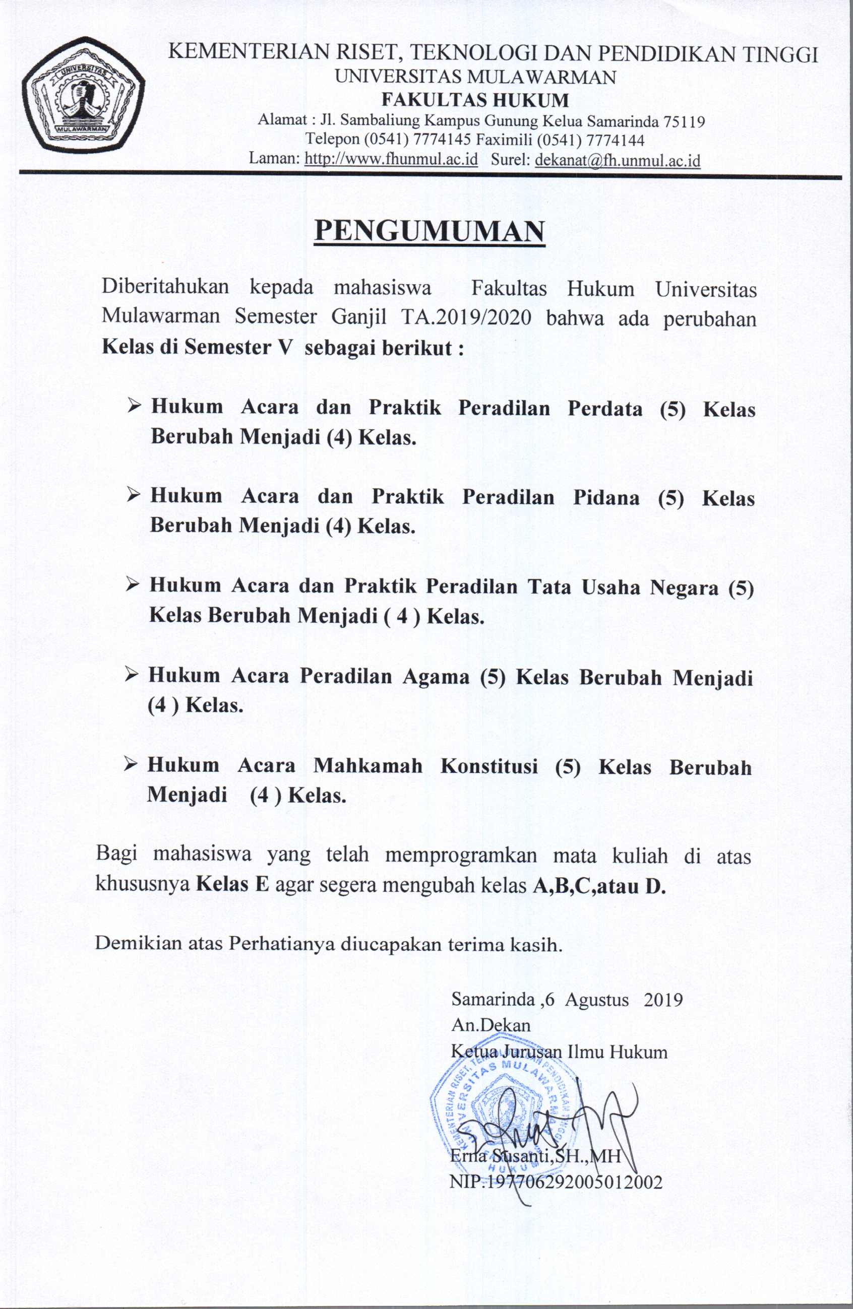 Diberitahukan kepada Mahasiswa Fakultas Hukum Universitas Mulawarman Semester Ganjil T.A. 2019/2020 bahwa ada perubahan Kelas di Semester 5. Detail pada surat terlampir.