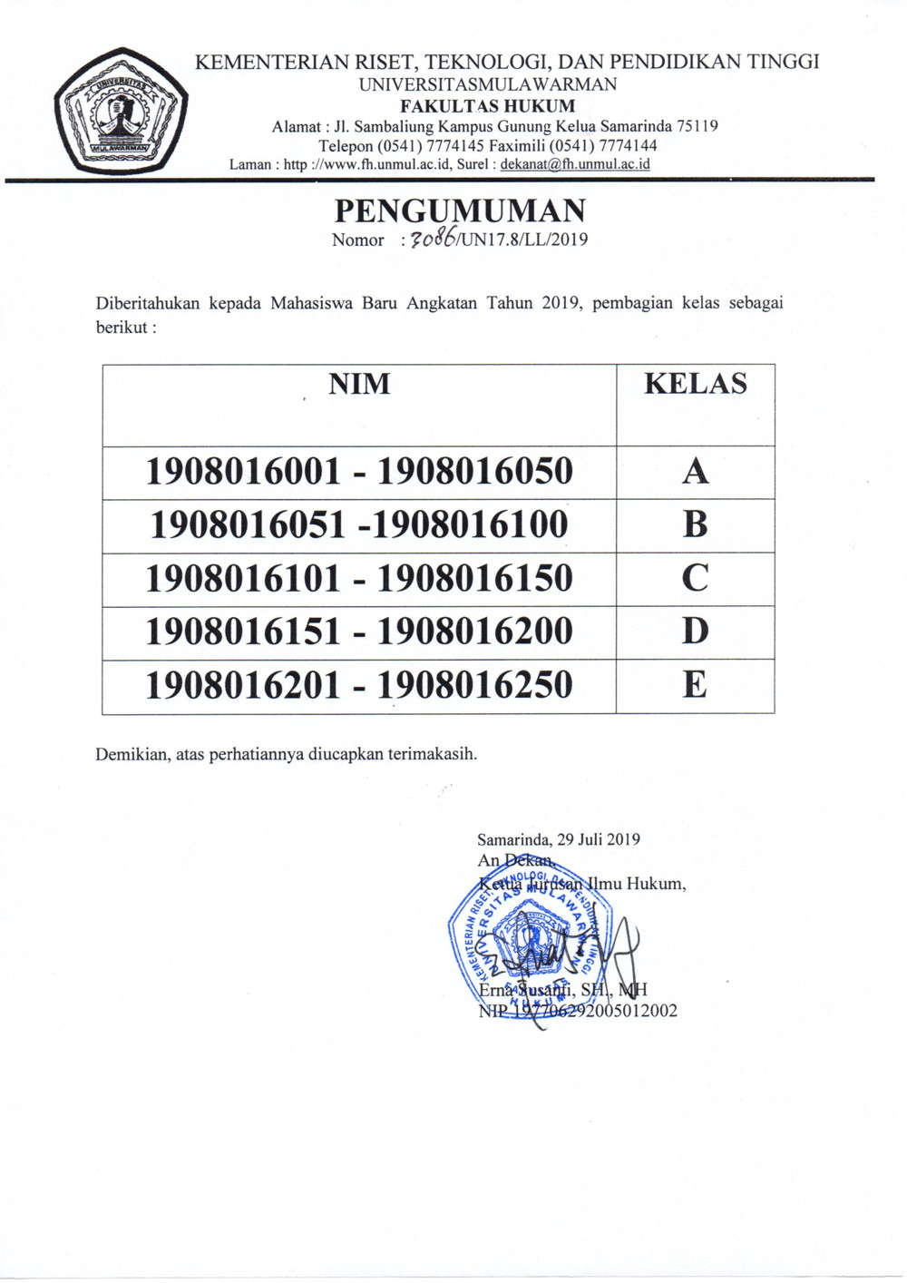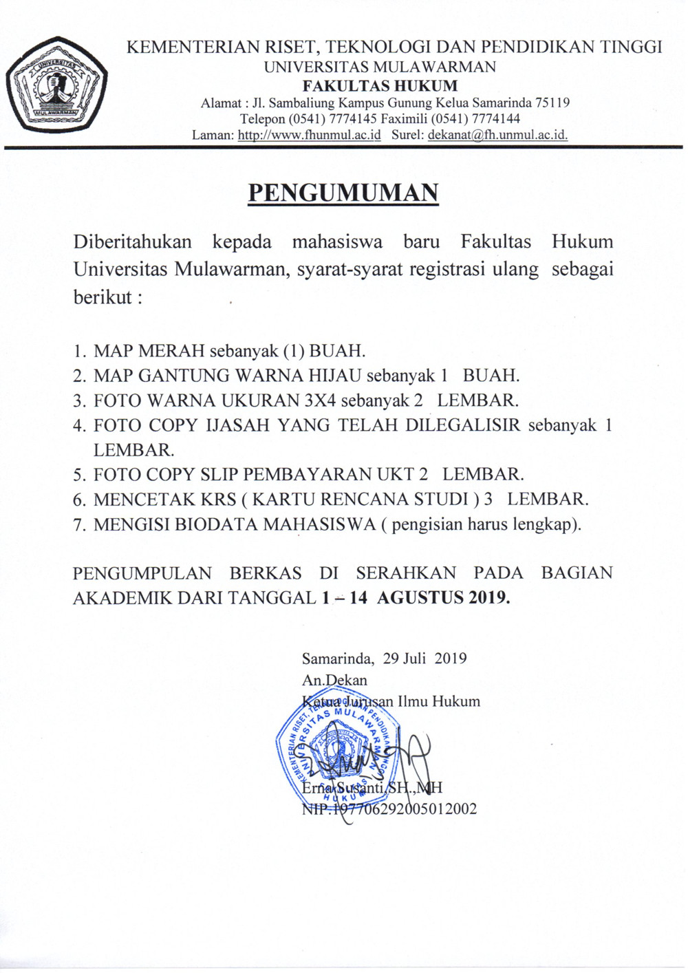 Diberitahukan kepada Mahasiswa Angkatan 2019 Fakultas Hukum Universitas Mulawarman persyaratan yang diperlukan untuk melakukan registrasi ulang dan pembagian kelas. Detail terlampir.