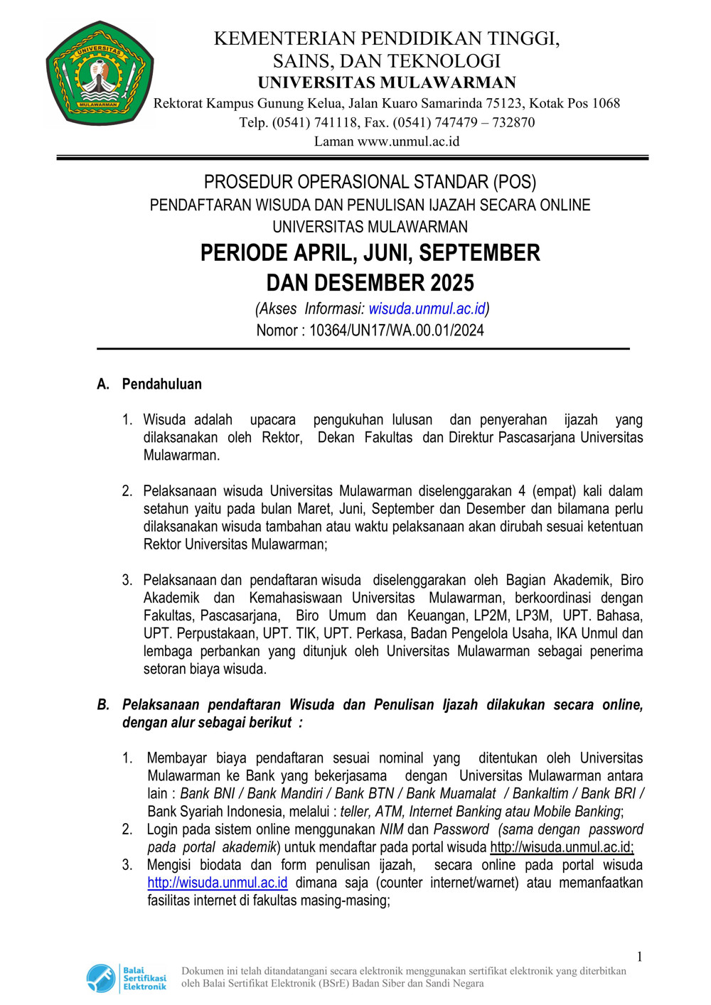 Berikut kami informasikan Prosedur Operasional Standar (POS) Pendaftaran Wisuda dan Penulisan Ijazah Online Universitas Mulawarman periode april, juni, september, dan desember tahun 2025.