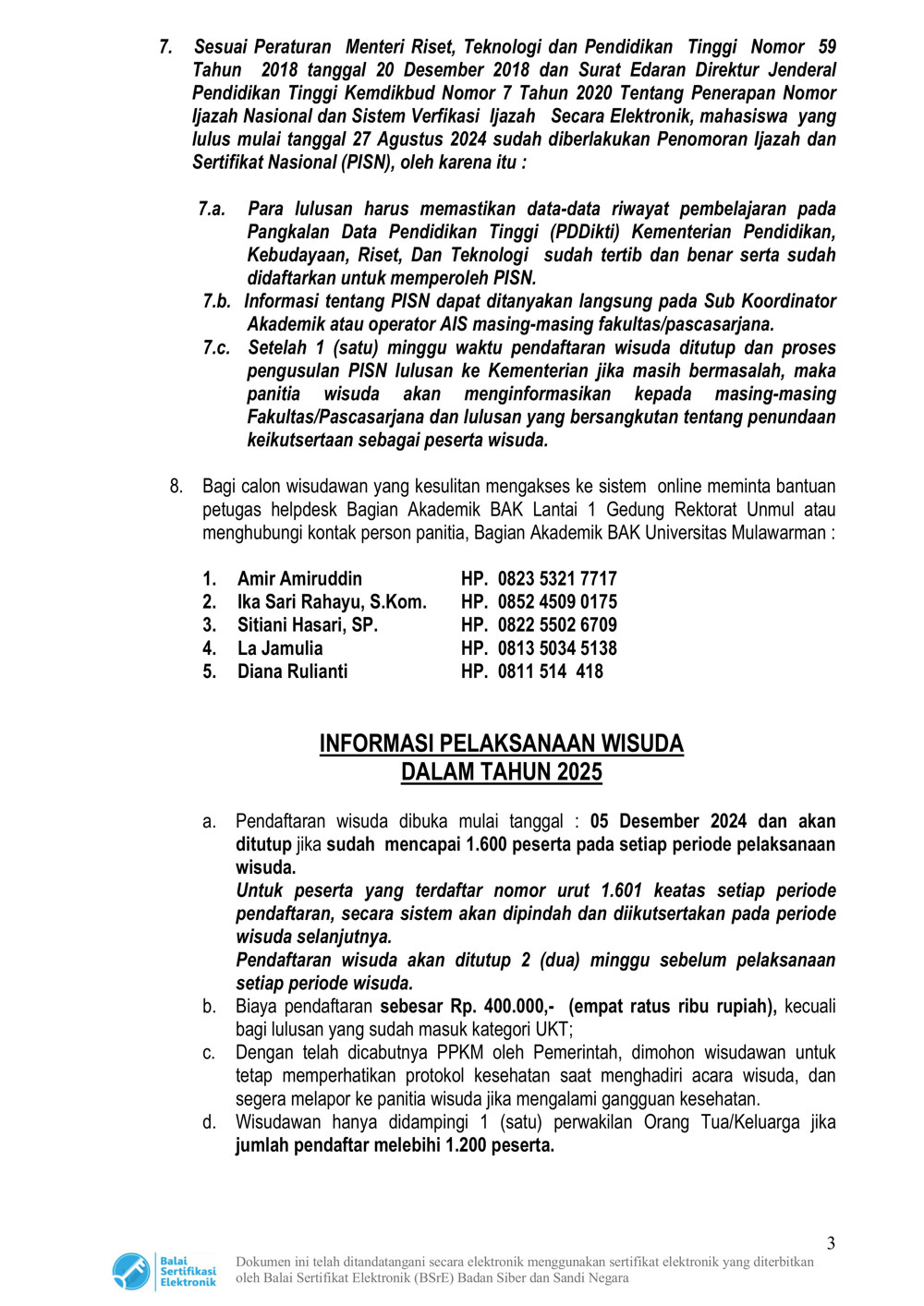 Foto 3: Surat Prosedur Operasi Standar (POS) Wisuda dan Penulisan Ijazah Online Tahun 2025 Universitas Mulawarman - Page 3