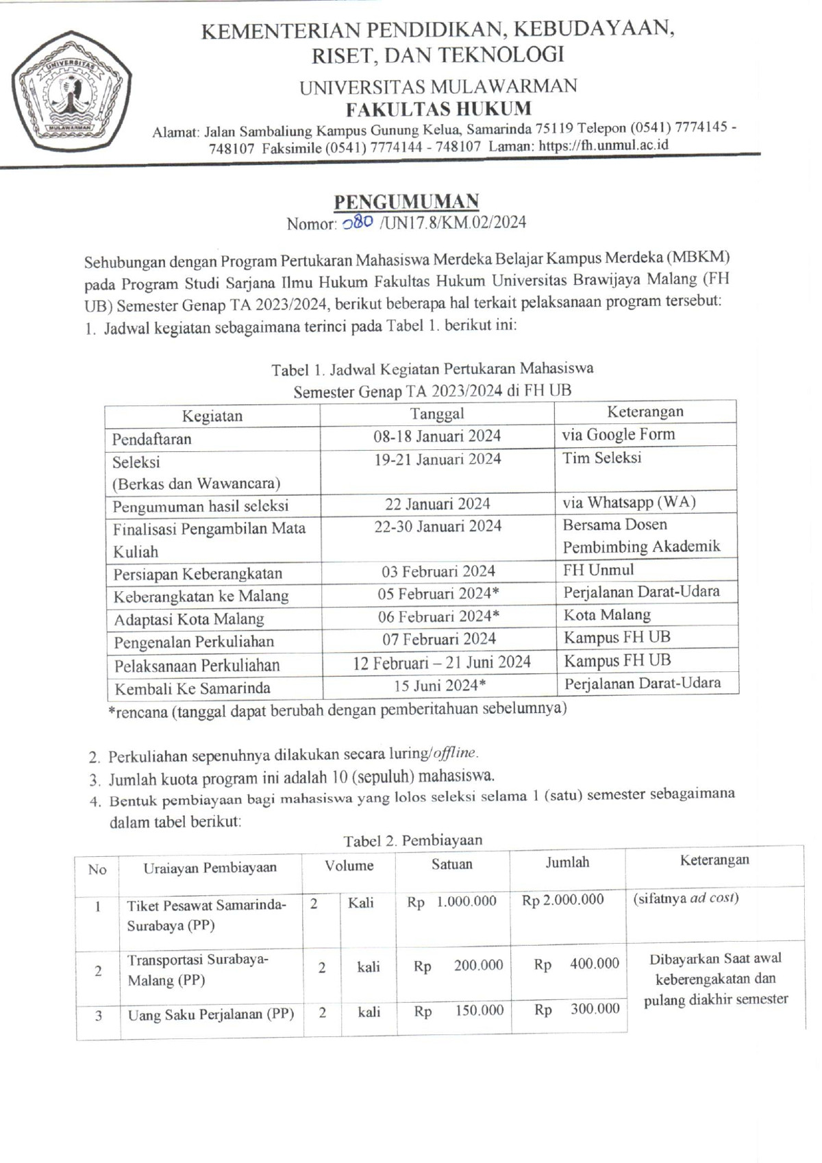 Foto 1: Pengumuman Program Pertukaran Mahasiswa MBKM Fakultas Hukum Universitas Brawijaya (FH UB) Malang Semester Genap TA 2023/2024 - Page 1