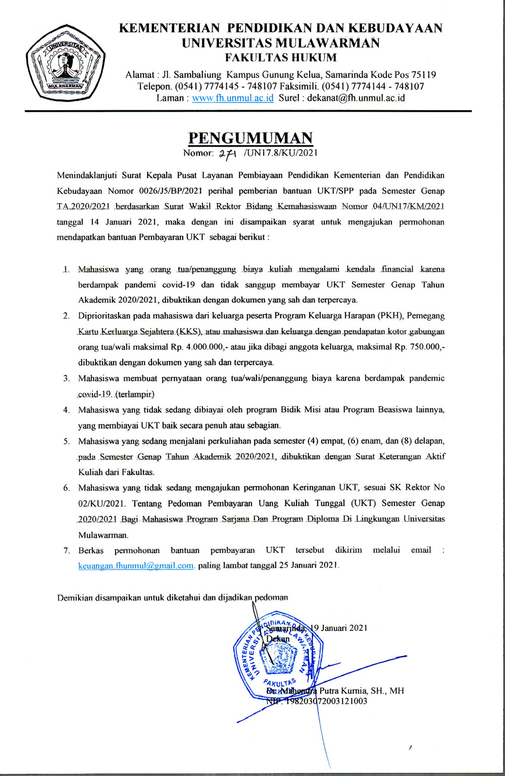 Menindaklanjuti Surat Kepala Pusat Layanan Pembiayaan Pendidikan Kementerian Pendidikan dan Kebudayaan Nomor 0026/J5/BP/2021 perihal pemberian bantuan UKT/SPP pada Semester Genap T.A. 2020/2021 dan berdasarkan Surat Wakil Rektor Bidang Kemahasiswaan Nomor 04/UN17/KM/2021 tanggal 14 Januari 2021, maka dengan ini disampaikan syarat untuk mengajukan permohonan mendapatkan bantuan pembayaran UKT.