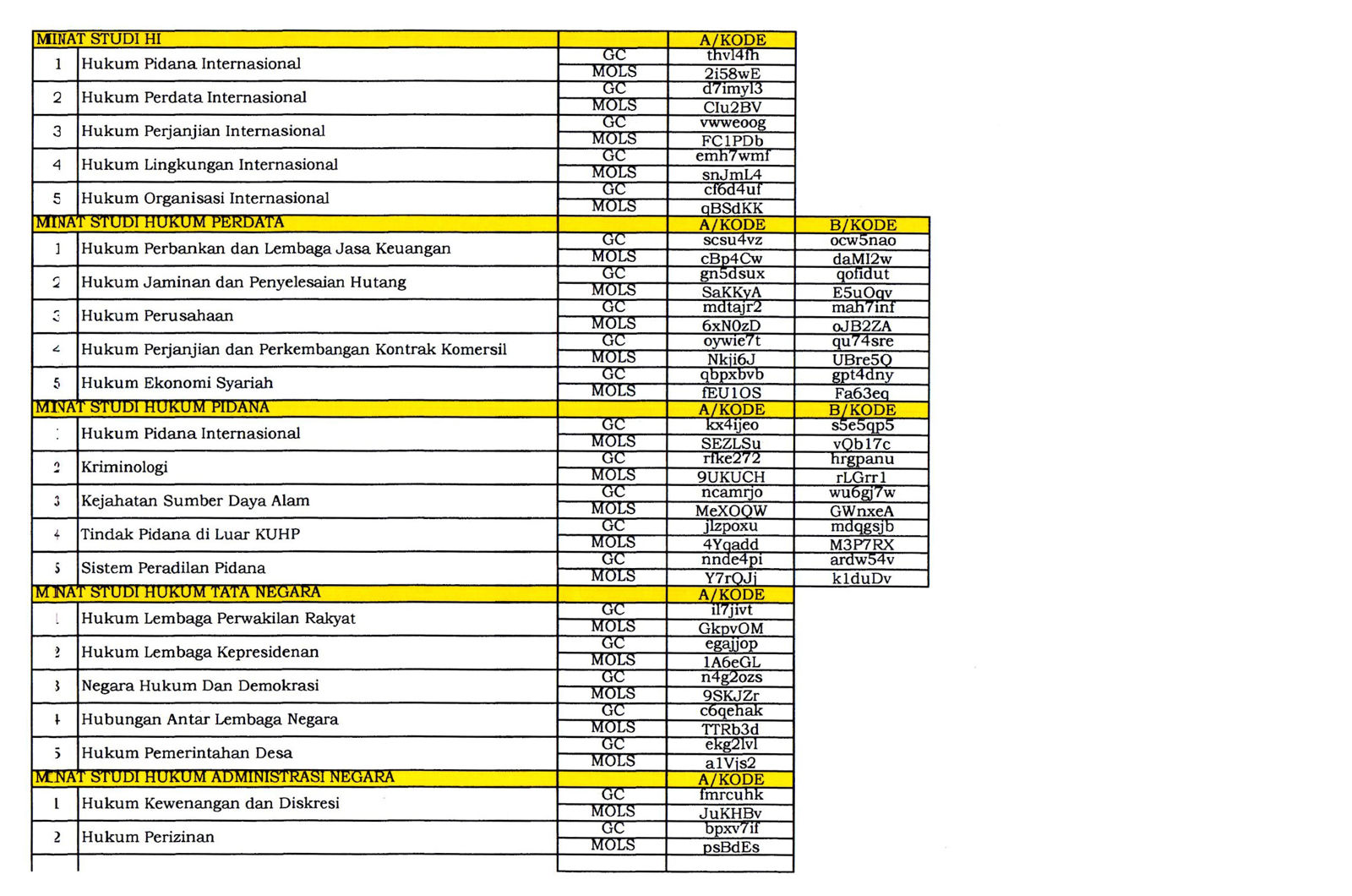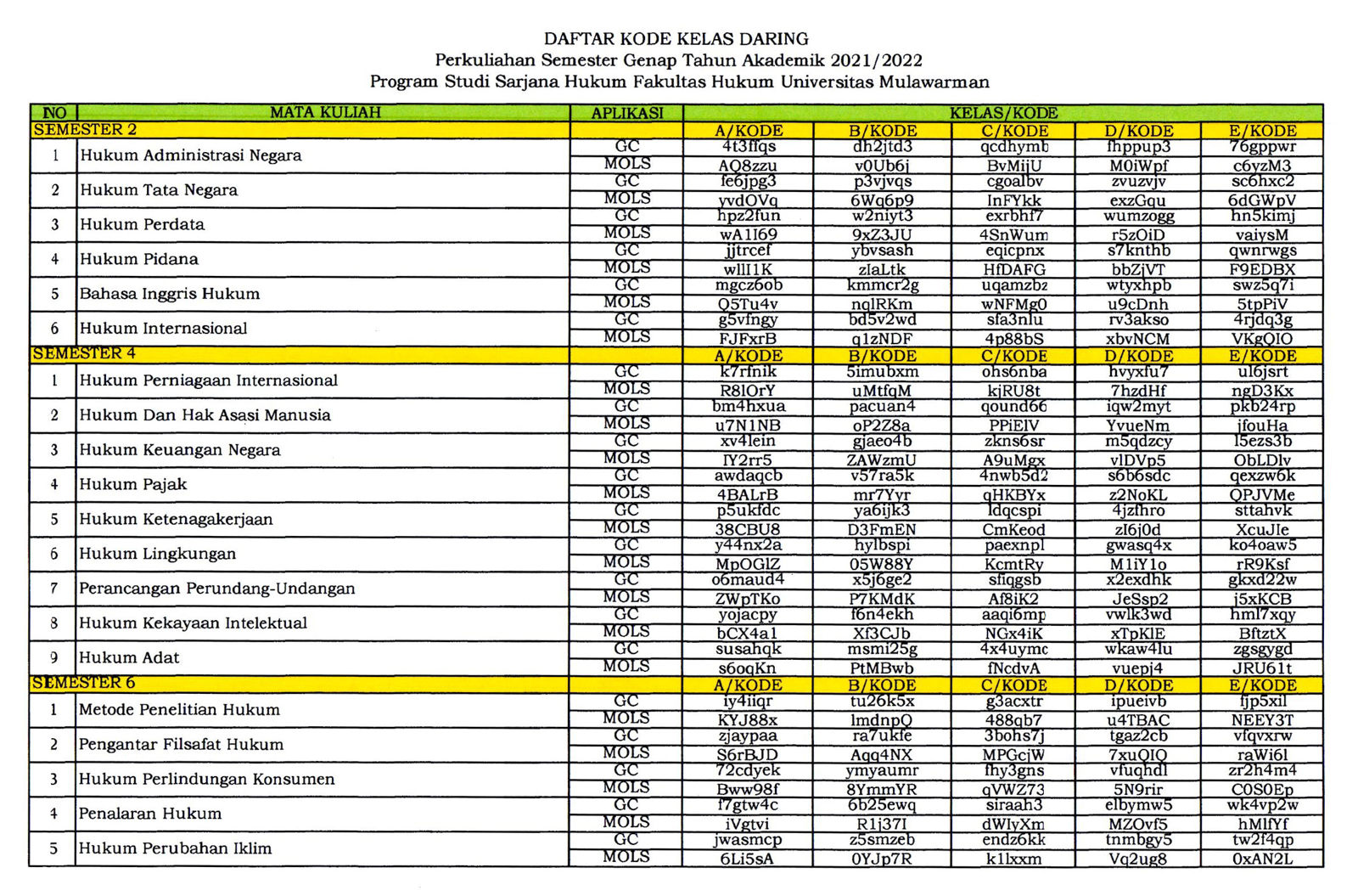 Daftar Kode Kelas Daring Perkuliahan Semester Genap TA 2021/2022 Program Studi Sarjana Hukum Fakultas Hukum Universitas Mulawarman