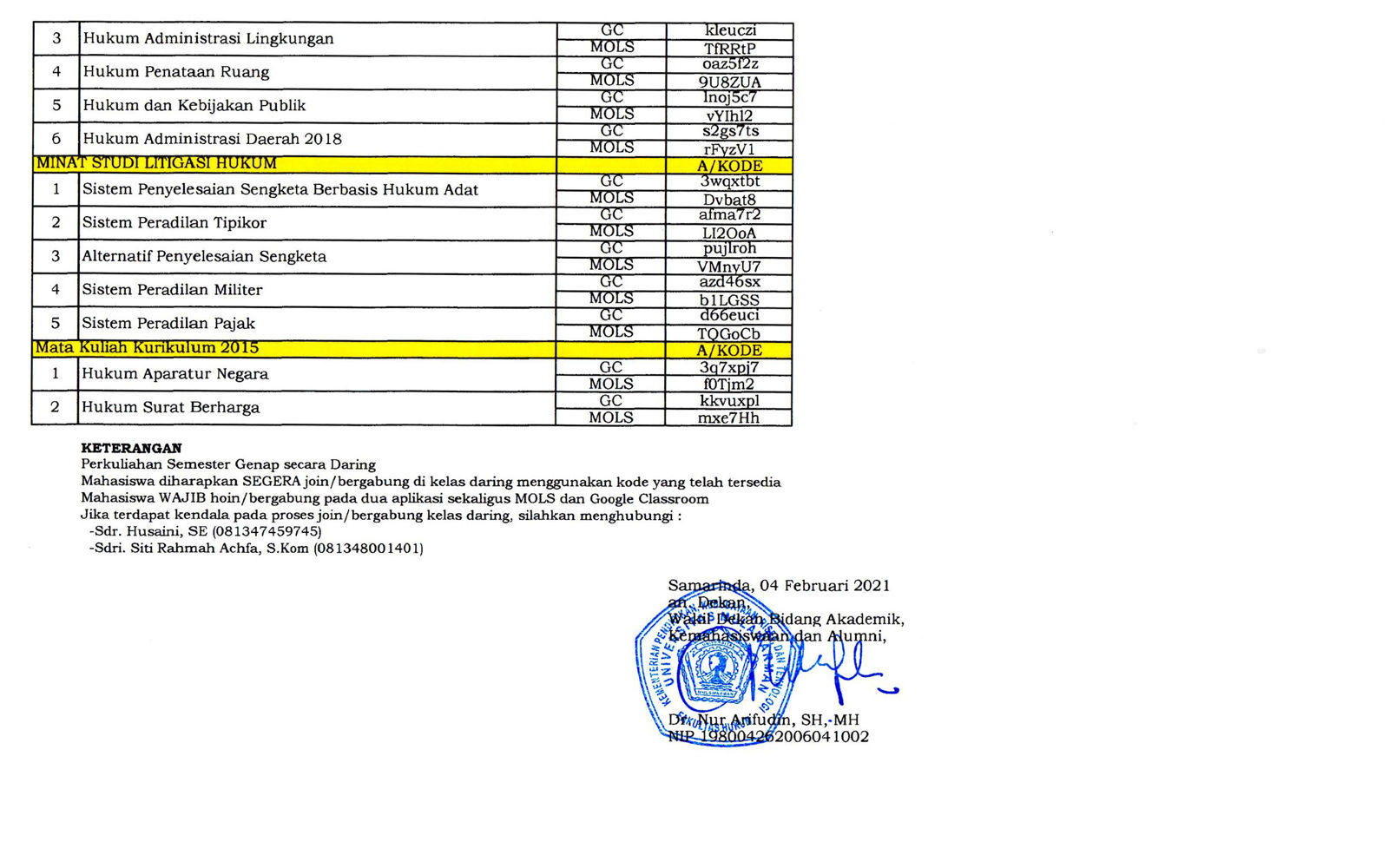 Foto 1: Daftar Kode Kelas Daring menggunakan Google Classroom dan MOLS pada Perkuliahan Semester Genap T.A. 2021/2022 FH UNMUL - Page 1