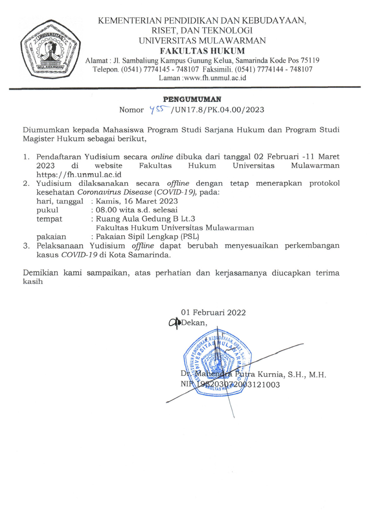 Diinformasikan kepada Mahasiswa Fakultas Hukum yang telah dinyatakan lulus pendadaran, bahwa Pendaftaran Yudisium Gelombang - 1 Tahun 2023 Fakultas Hukum dibuka mulai tanggal 2 Februari - 11 Maret 2023. Pendaftaran yudisium menggunakan sistem online pada website Fakultas Hukum Universitas Mulawarman. Pelaksanaan yudisium pada hari Kamis, tanggal 16 Maret 2023 secara offline dengan tetap memperhatikan protokol kesehatan. Pelaksanaan Yudisium secara offline dapat berubah menyesuaikan perkembangan kasus Covid-19 di Kota Samarinda.