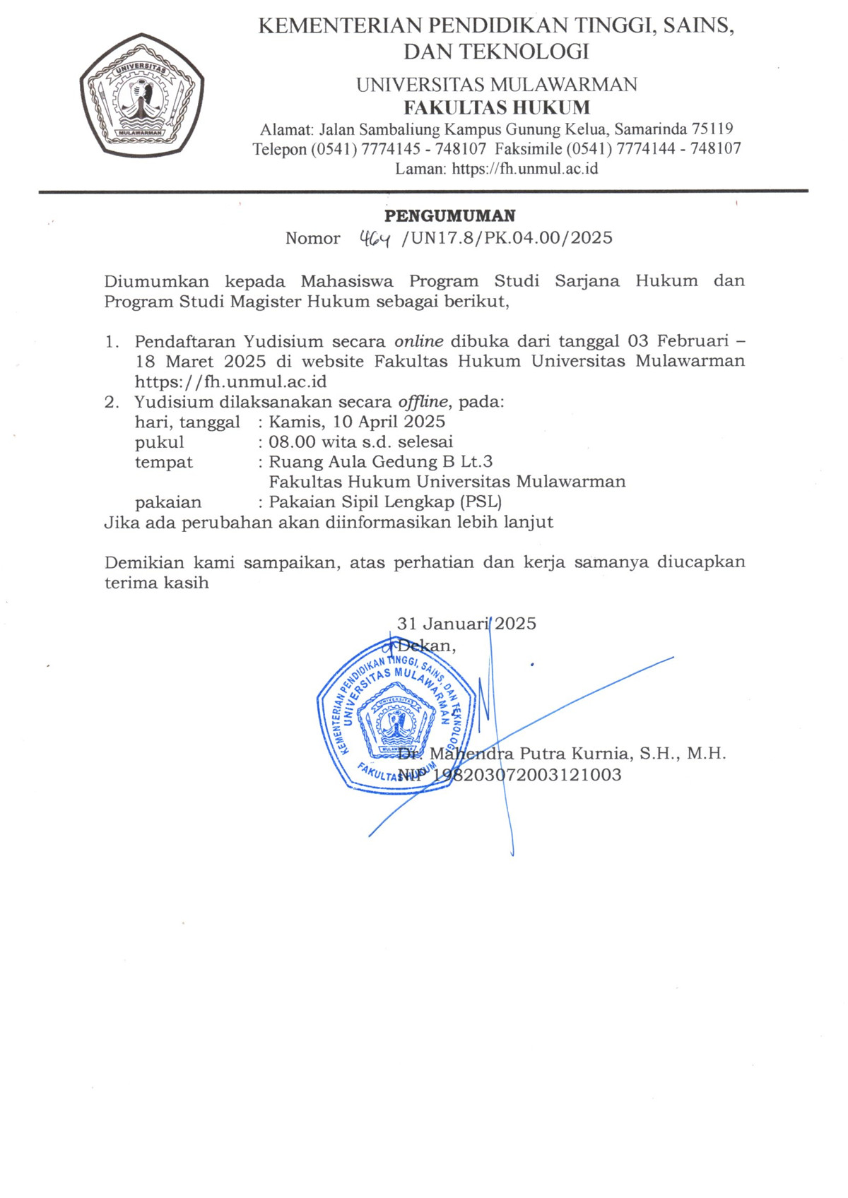 Foto 1: Surat Pengumuman Perihal Pendaftaran Yudisium Gelombang 1 Tahun 2025 Fakultas Hukum UNMUL