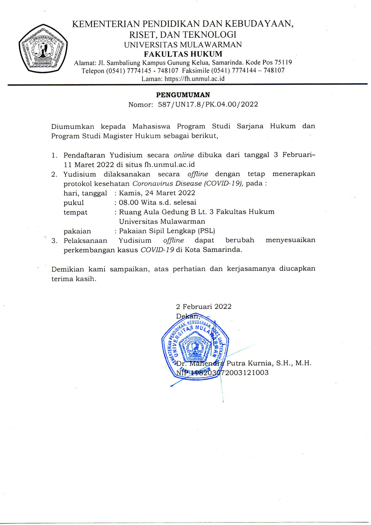 Diinformasikan kepada Mahasiswa Fakultas Hukum yang telah dinyatakan lulus pendadaran, bahwa Pendaftaran Yudisium Gelombang - 1 Tahun 2022 Fakultas Hukum dibuka mulai tanggal 3 Februari - 11 Maret 2021. Pendaftaran yudisium menggunakan sistem online pada website Fakultas Hukum Universitas Mulawarman. Pelaksanaan yudisium pada hari Kamis, tanggal 24 Maret 2022 secara offline dengan tetap memperhatikan protokol kesehatan. Pelaksanaan Yudisium secara offline dapat berubah menyesuaikan perkembangan kasus Covid-19 di Kota Samarinda.