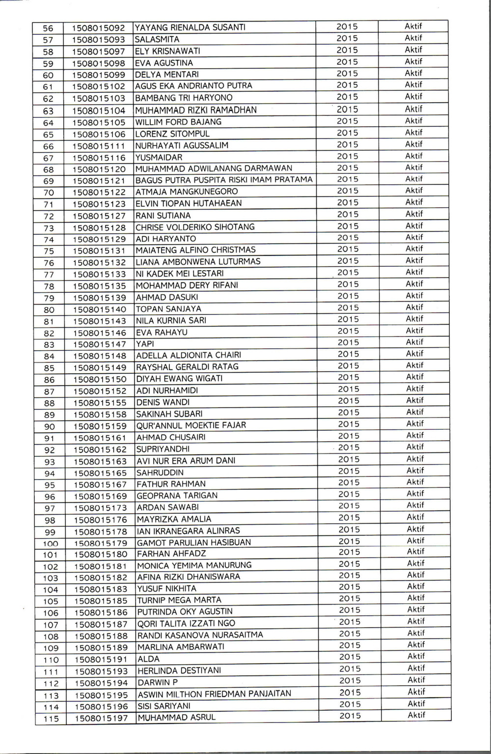 Foto 5: Lampiran Daftar Nama Mahasiswa Prodi Sarjana Hukum FH UNMUL Angkatan 2015 yang Berstatus Aktif - Page 2