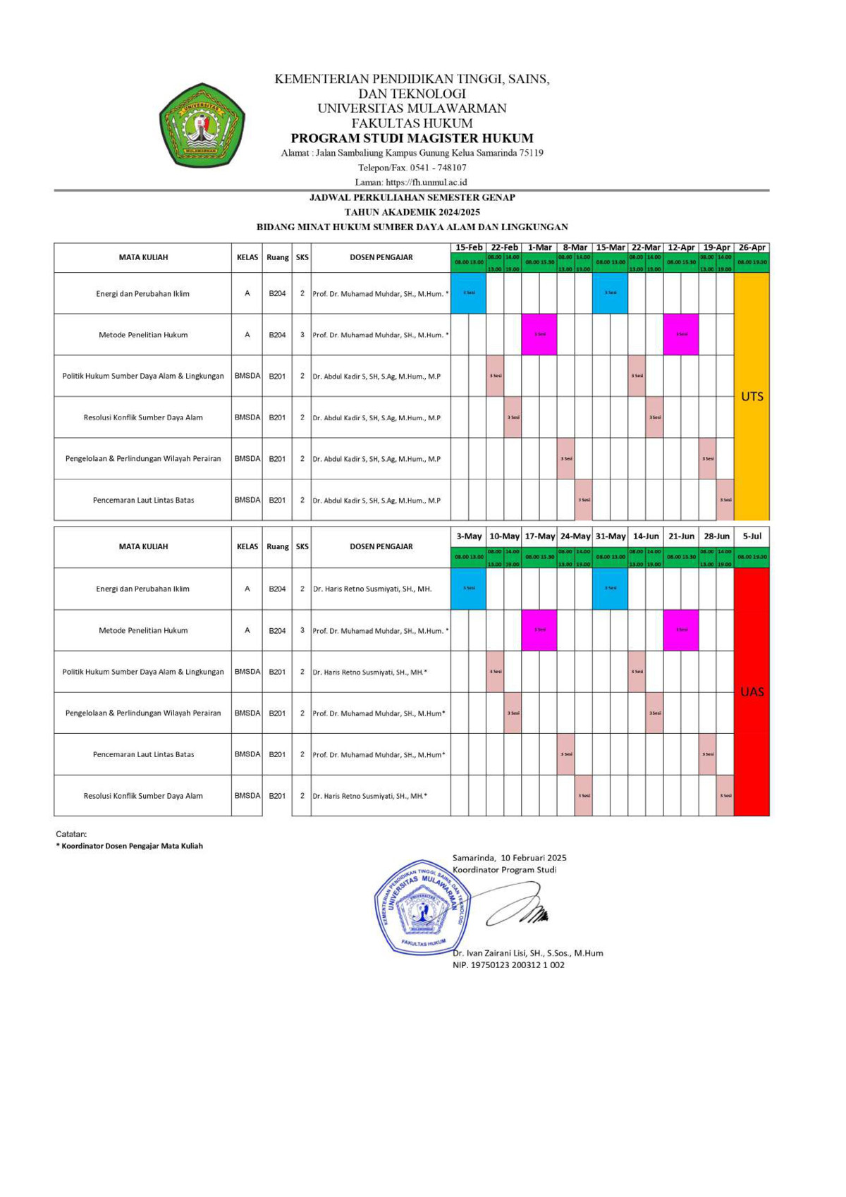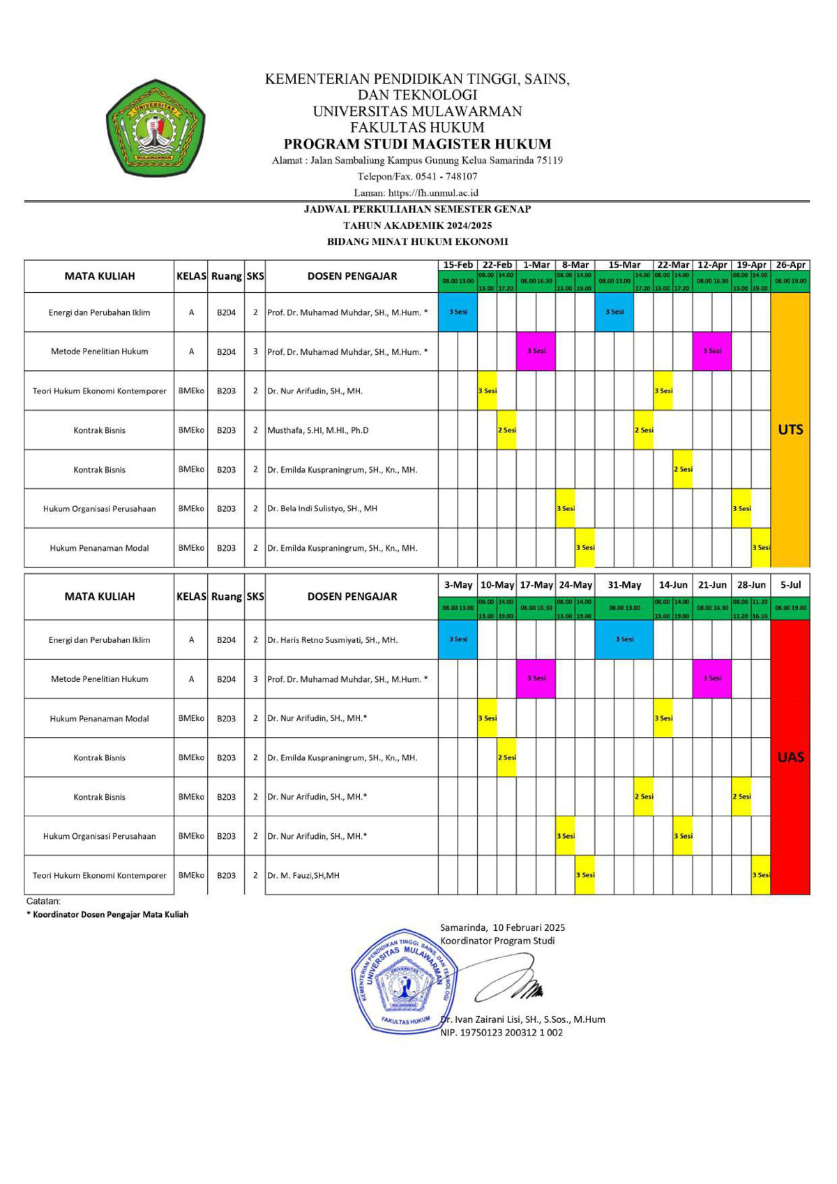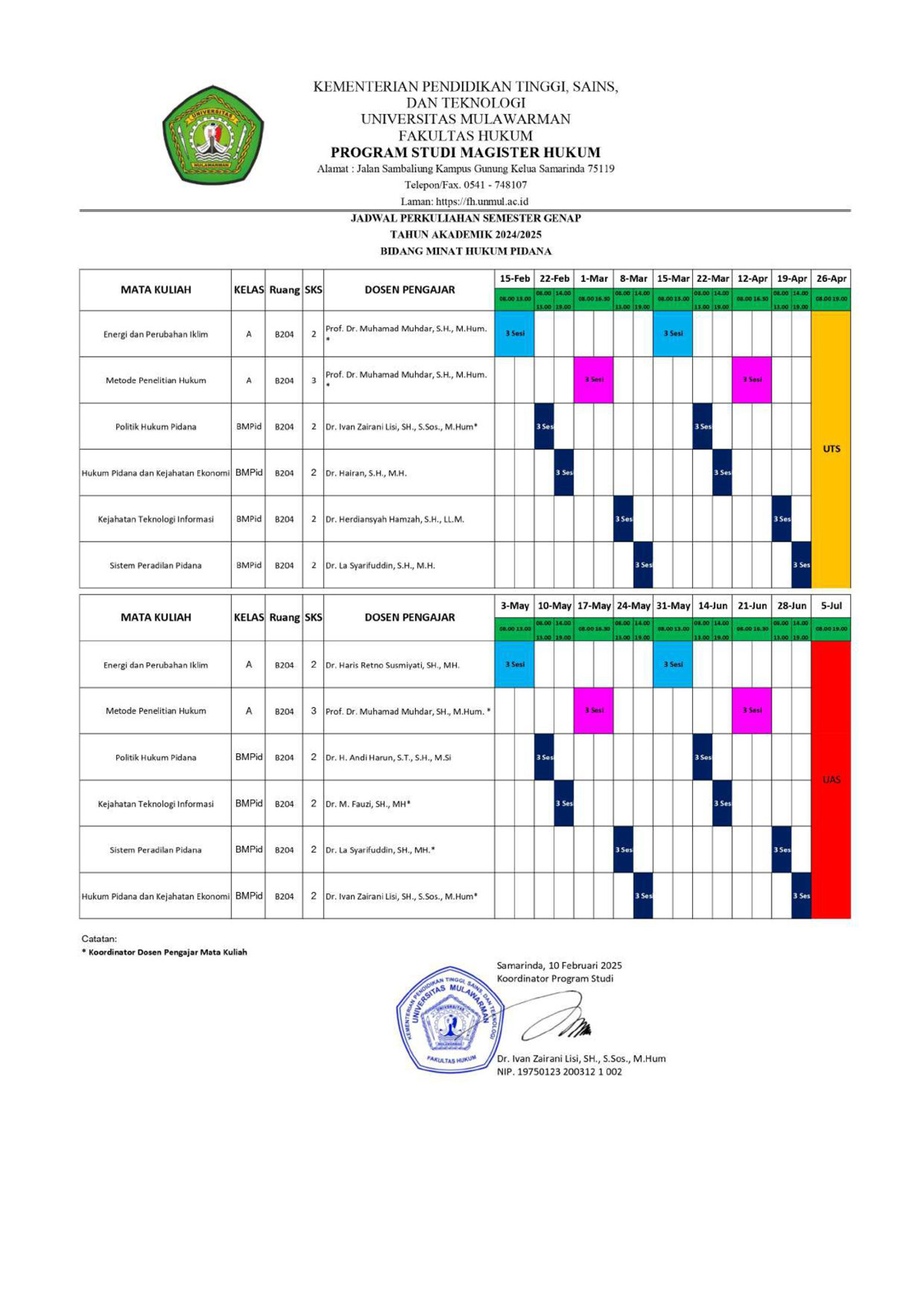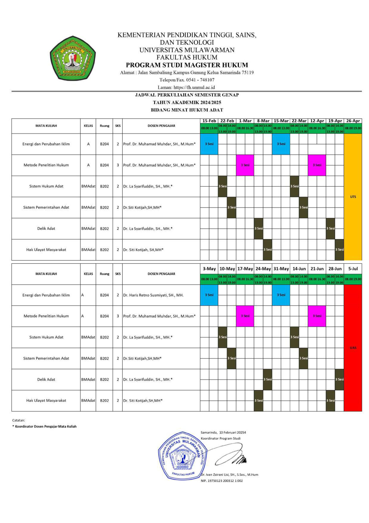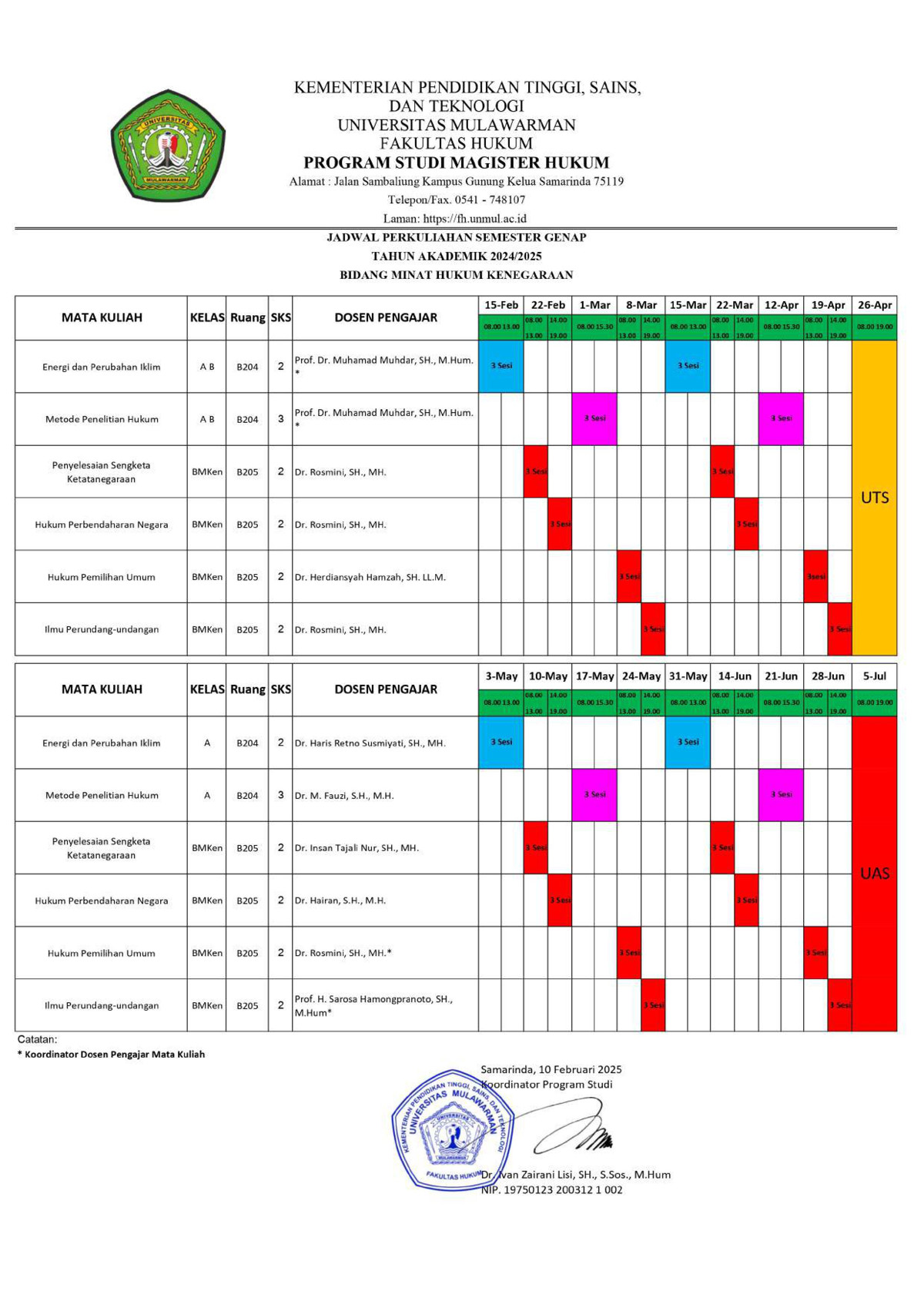 Berikut kami informasikan Jadwal Perkuliahan Semester Genap Program Studi Magister Hukum Tahun Akademik 2024/2025 Fakultas Hukum Universitas Mulawarman.
