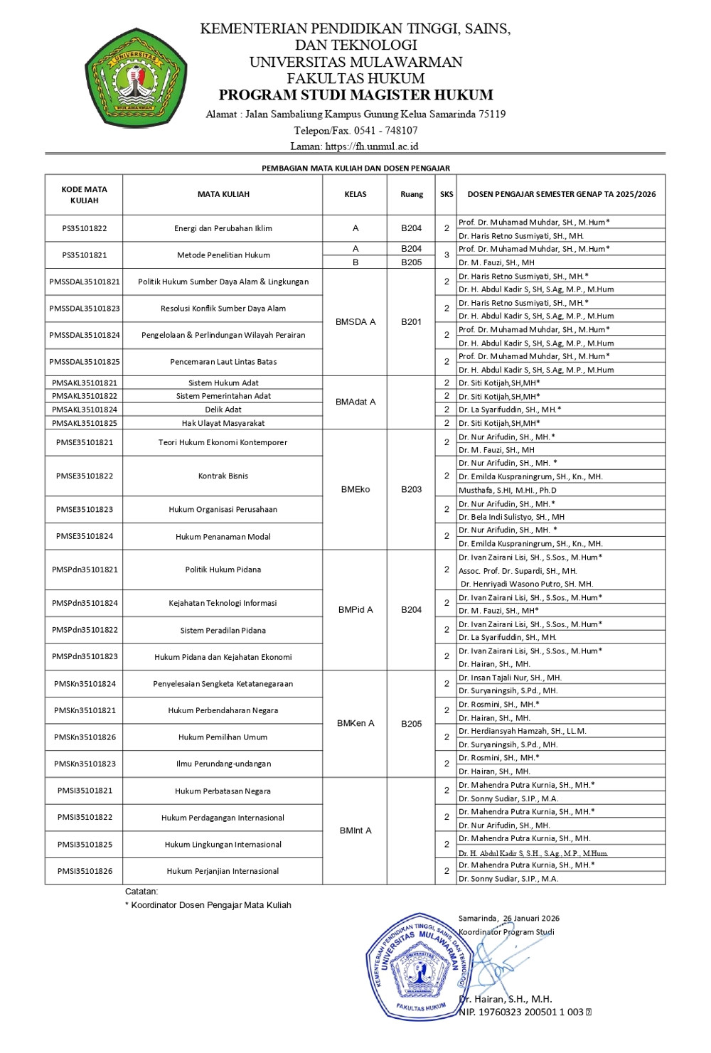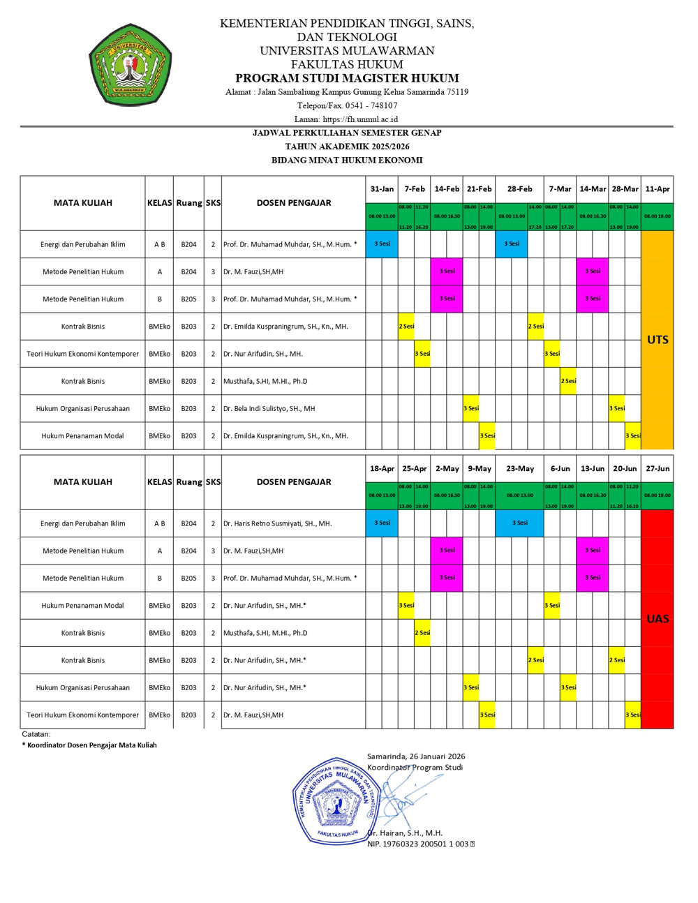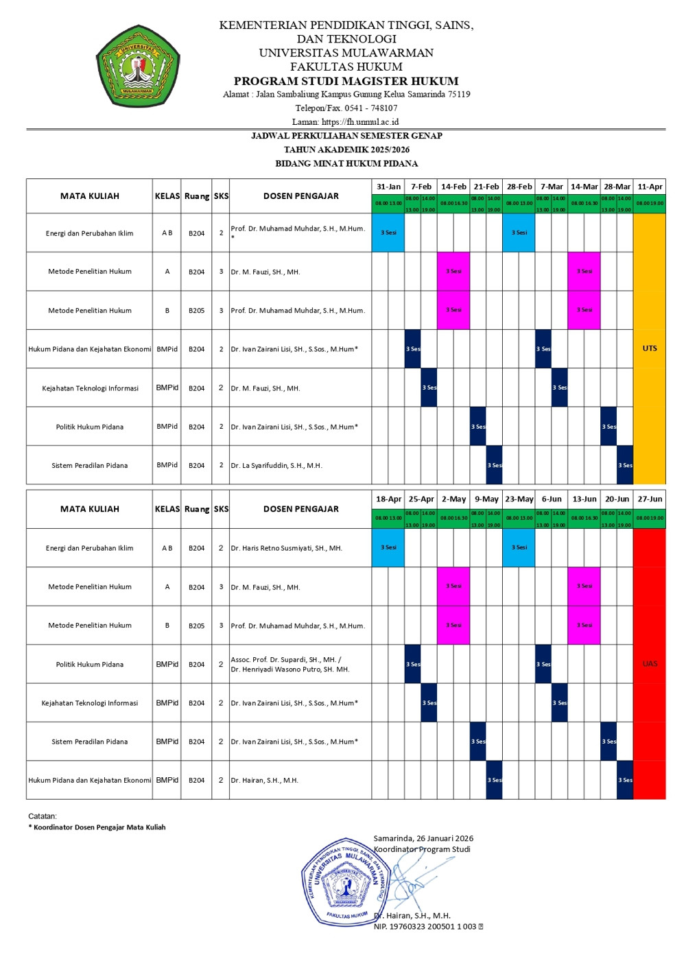 Berikut kami informasikan Jadwal Kuliah Program Studi Magister Hukum Fakultas Hukum Universitas Mulawarman Semester Genap Tahun Akademik 2025/2026.