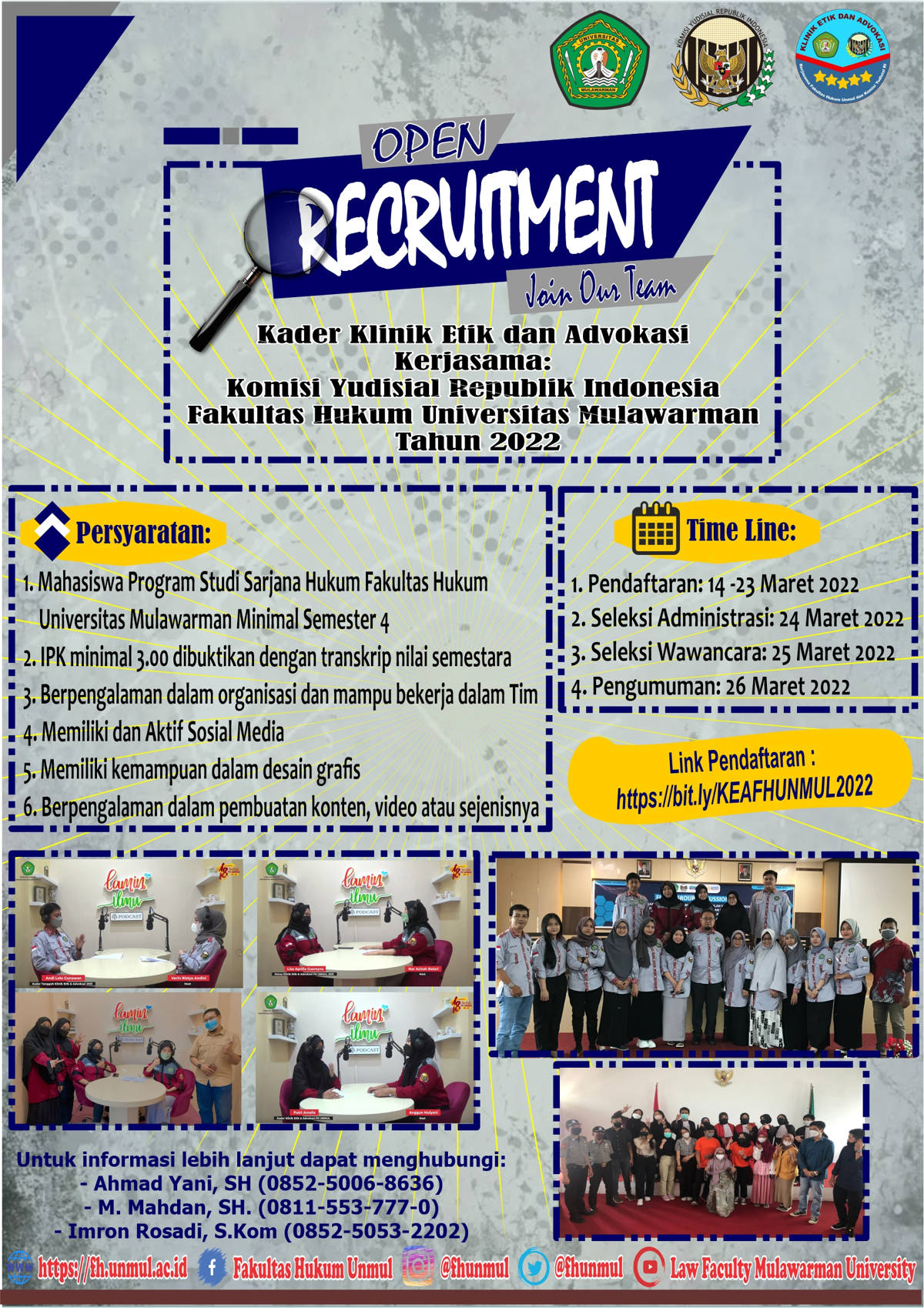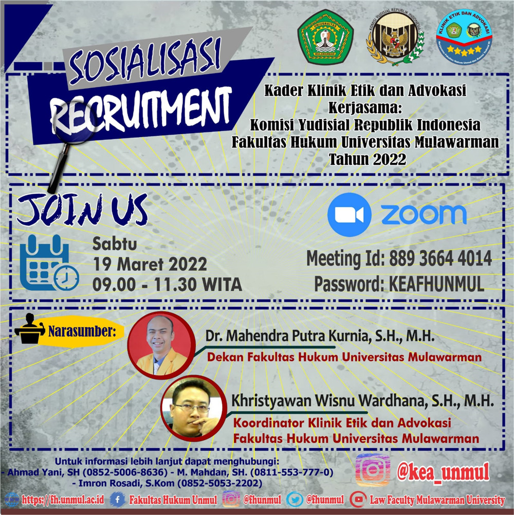 Ayo daftarkan dirimu dan bergabung bersama kami dalam Klinik Etik dan Advokasi tahun 2022 kerjasama Komisi Yudisial Republik Indonesia dan Fakultas Hukum Universitas Mulawarman.