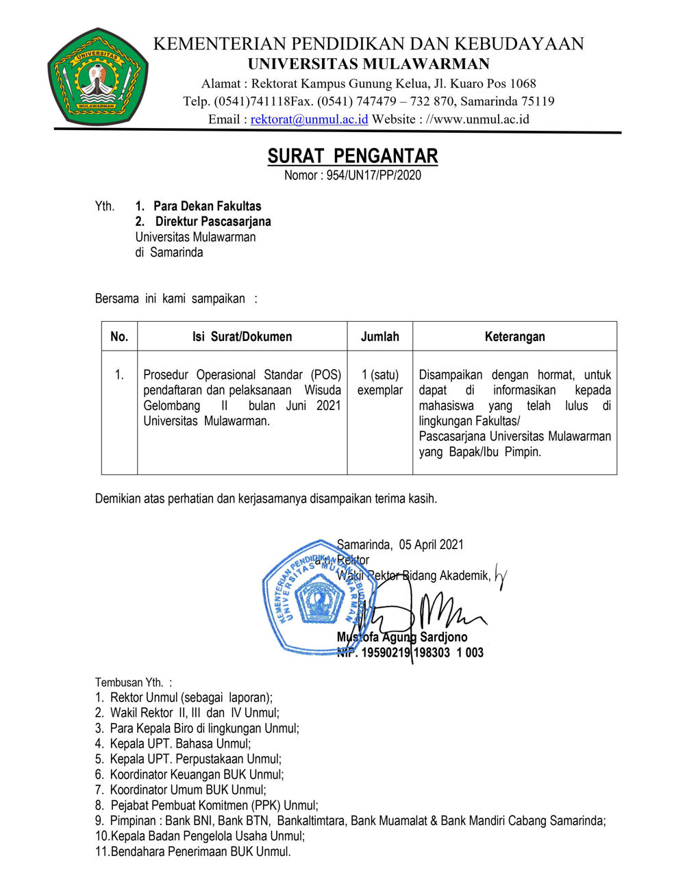 Foto 1: Surat Pengantar Prosedur Operasi Standar (POS) Wisuda dan Penulisan Ijazah Online bulan Juni 2021 Universitas Mulawarman