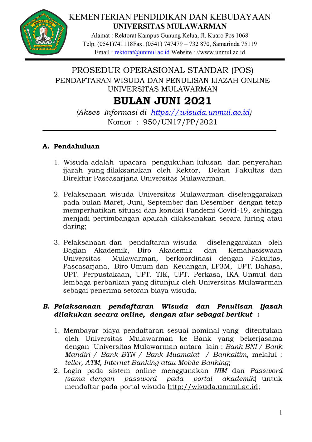 Foto 2: Surat Prosedur Operasi Standar (POS) Wisuda dan Penulisan Ijazah Online bulan Juni 2021 Universitas Mulawarman - Page 1