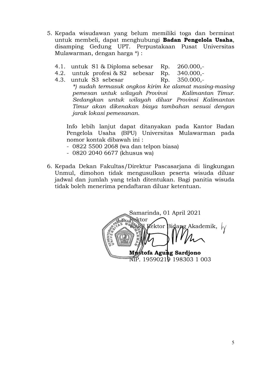Foto 6: Surat Prosedur Operasi Standar (POS) Wisuda dan Penulisan Ijazah Online bulan Juni 2021 Universitas Mulawarman - Page 5