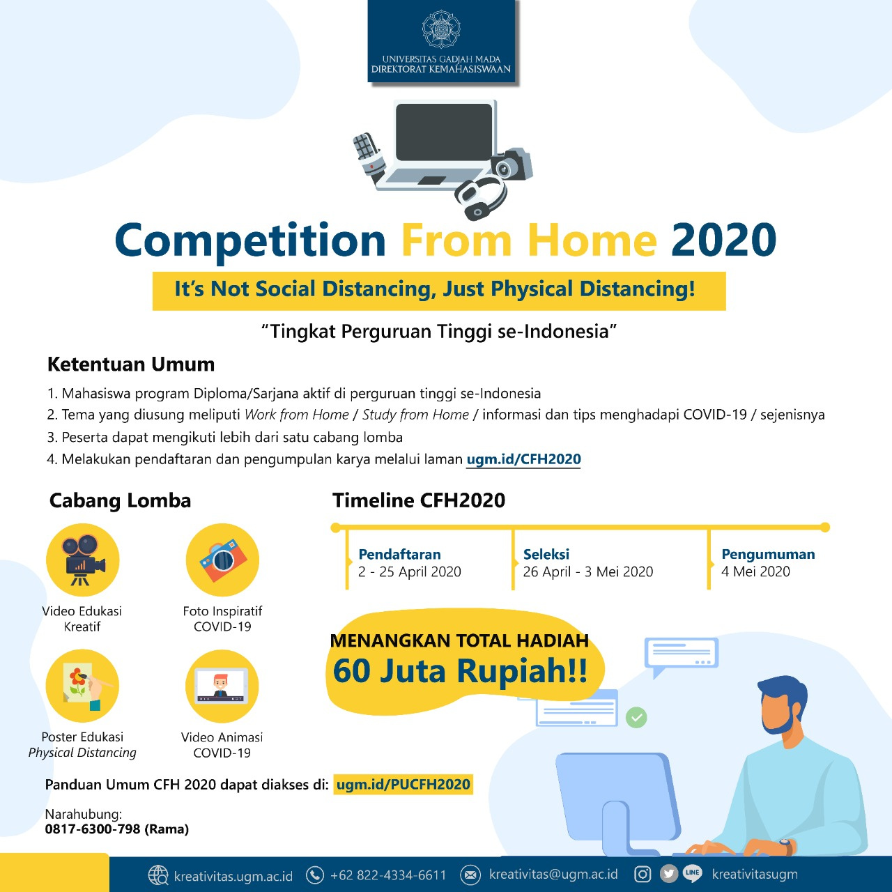Direktorat Kemahasiswaan Universitas Gadjah Mada mengadakan Competition From Home 2020 Tingkat Perguruan Tinggi se-Indonesia dengan tagline "It's Not Social Distancing, Just Physical Distancing!". Ada beberapa cabang lomba dengan tema yang diusung meliputi Work From Home, Study From Home dan Tips menghadapi COVID-19 yang dapat kalian ikuti.