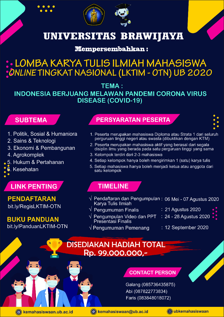 Universitas Brawijaya Malang mempersembahkan Lomba Karya Tulis Ilmiah Mahasiswa Online Tingkat Nasional (LKTI - OTN) - UB 2020 dengan tema "Indonesia Berjuang Melawan Pandemi Corona Virus Disease (COVID-19)". Total hadiah mencapai total 99 Juta Rupiah.