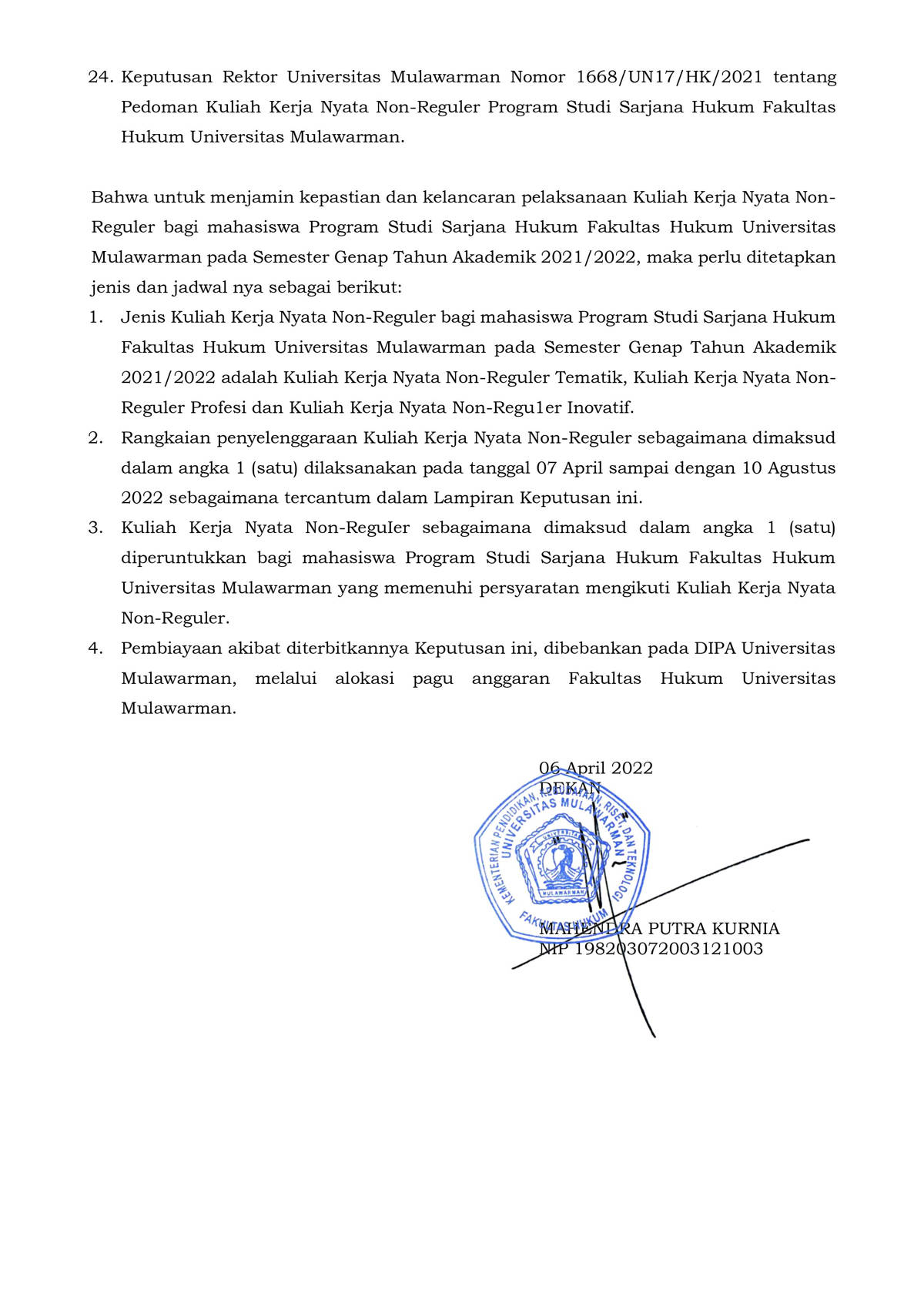 Berikut kami informasikan Surat Keputusan Rektor Universitas Mulawarman 1668/UN17/HK/2021 Tentang Pedoman Kuliah Kerja Nyata Non Reguler Program Studi Sarjana Hukum Universitas Mulawarman. Adapun di dalam Pedoman KKN Non Reguler dilampirkan juga alur pelaksanaan KKN Non-Reguler dan contoh format berkas-berkas kelengkapan yang diperlukan dalam pelaksanaan KKN.