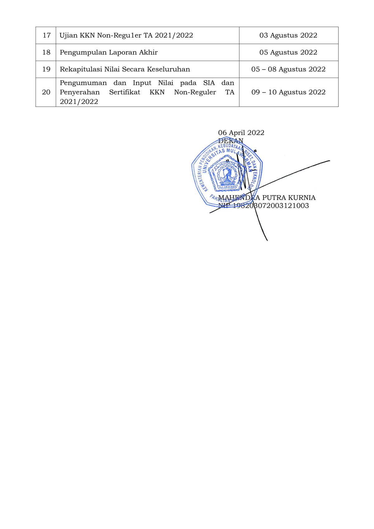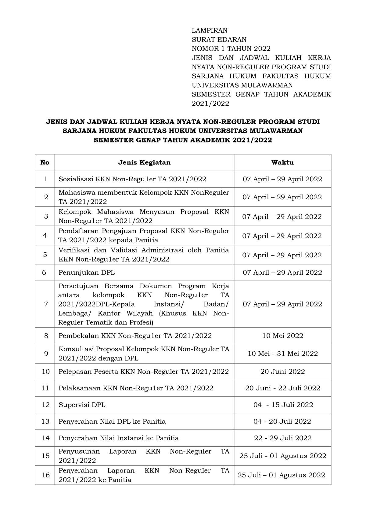 Foto 4: Lampiran Surat Edaran Dekan Nomor 1 Tahun 2022 Tentang Jenis & Jadwal KKN Non-Reguler FH Unmul Tahun 2022 - Page 1