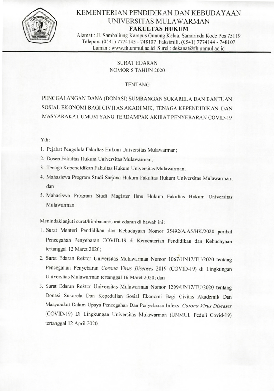 Foto 1: Surat Edaran Dekan Nomor 5 Tahun 2020 Terkait Penggalangan Dana Di FH UNMUL - Page 1