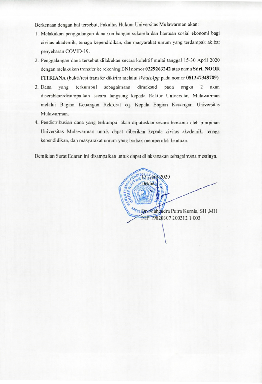 Foto 2: Surat Edaran Dekan Nomor 5 Tahun 2020 Terkait Penggalangan Dana Di FH UNMUL - Page 2