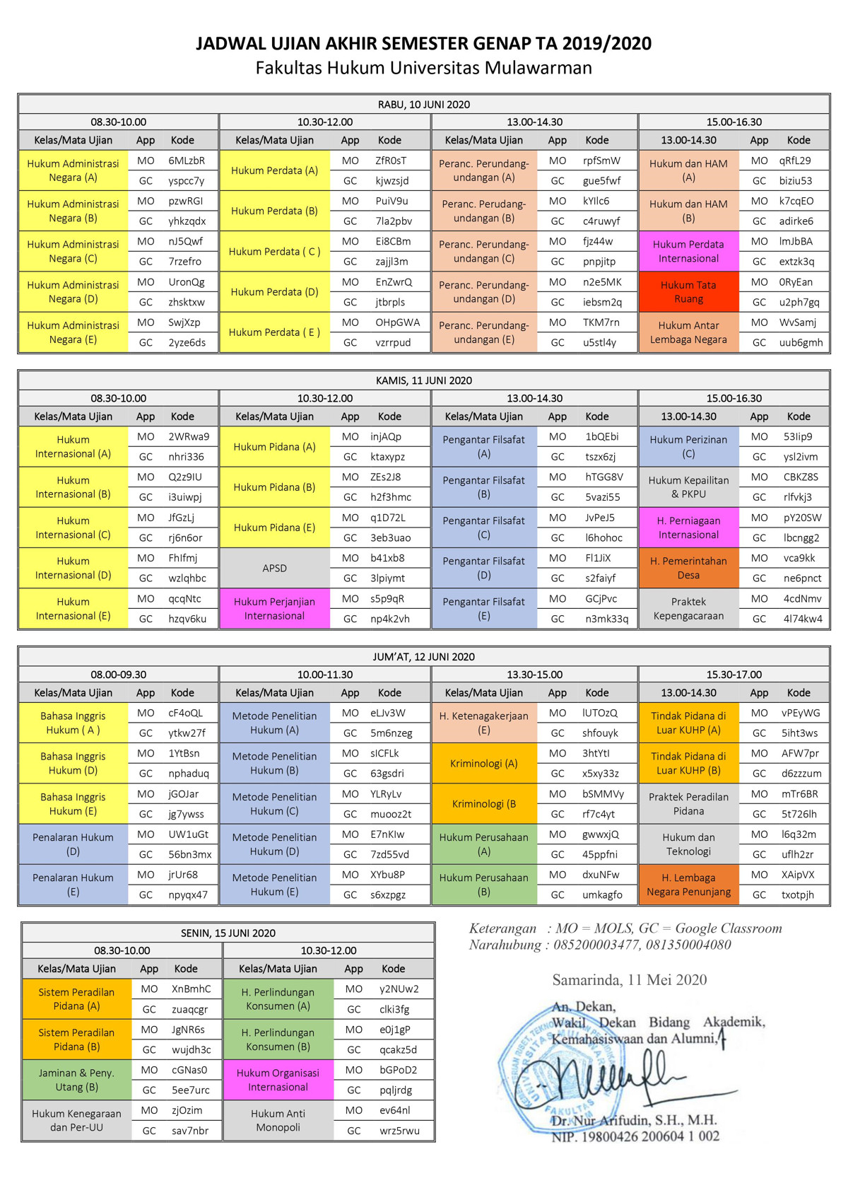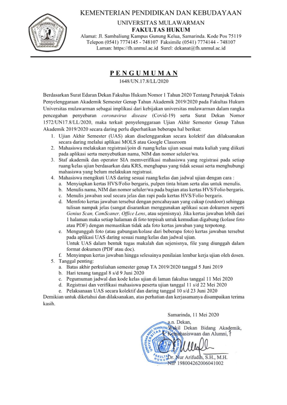 Berdasarkan Surat Edaran Dekan Fakultas Hukum Nomor 1 Tahun 2020 Tentang Petunjuk Teknis Penyelenggaraan Akademik Semester Genap TA 2019/2020 pada Fakultas Hukum Universitas Mulawarman sebagai implikasi dari kebijakan Universitas Mulawarman dalam rangka pencegahan penyebaran Corona Virus Disease (Covid-19), serta surat Dekan Nomor: 1572/UN17.8/LL/2020, maka terkait penyelenggaraan Ujian Akhir Semester Genap Tahun Akademik 2019/2020 secara daring perlu diperhatikan hal-hal sebagai berikut: