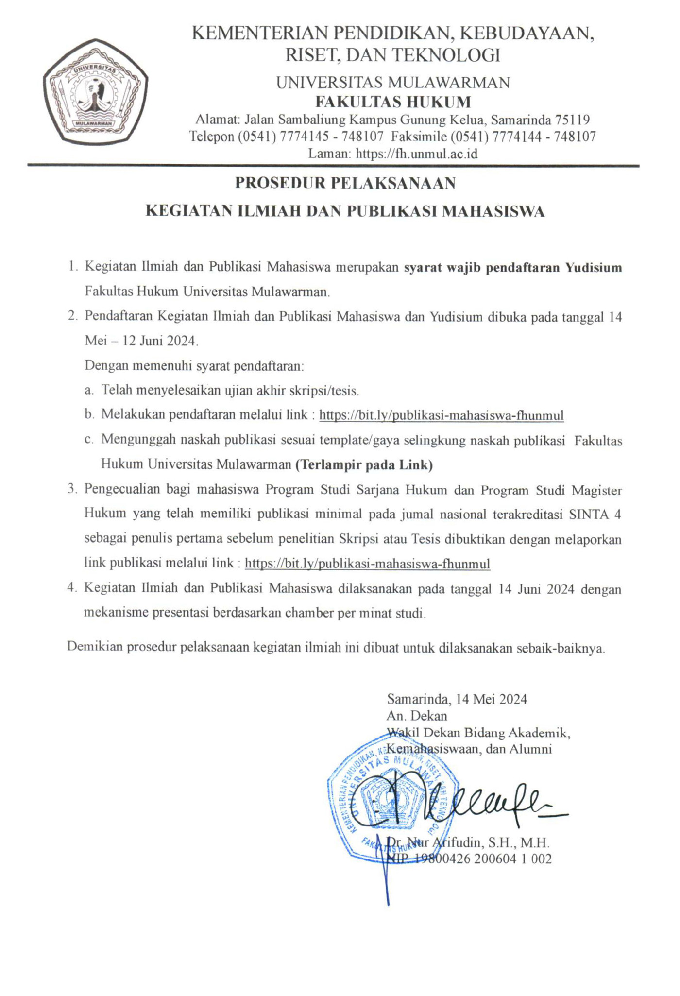 Kegiatan Ilmiah dan Publikasi Mahasiswa merupakan syarat wajib pendaftaran Yudisium Fakultas Hukum Universitas Mulawarman. Pendaftaran Kegiatan Ilmiah dan Publikasi Mahasiswa dan Yudisium Gelombang 2 Tahun 2024 dibuka pada tanggal 14 Mei s/d tanggal 12 Juni 2024. Kegiatan Ilmiah dan Publikasi Mahasiswa dilaksanakan pada tanggal 14 Juni 2024 dengan mekanisme presentasi berdasarkan chamber per minat studi.