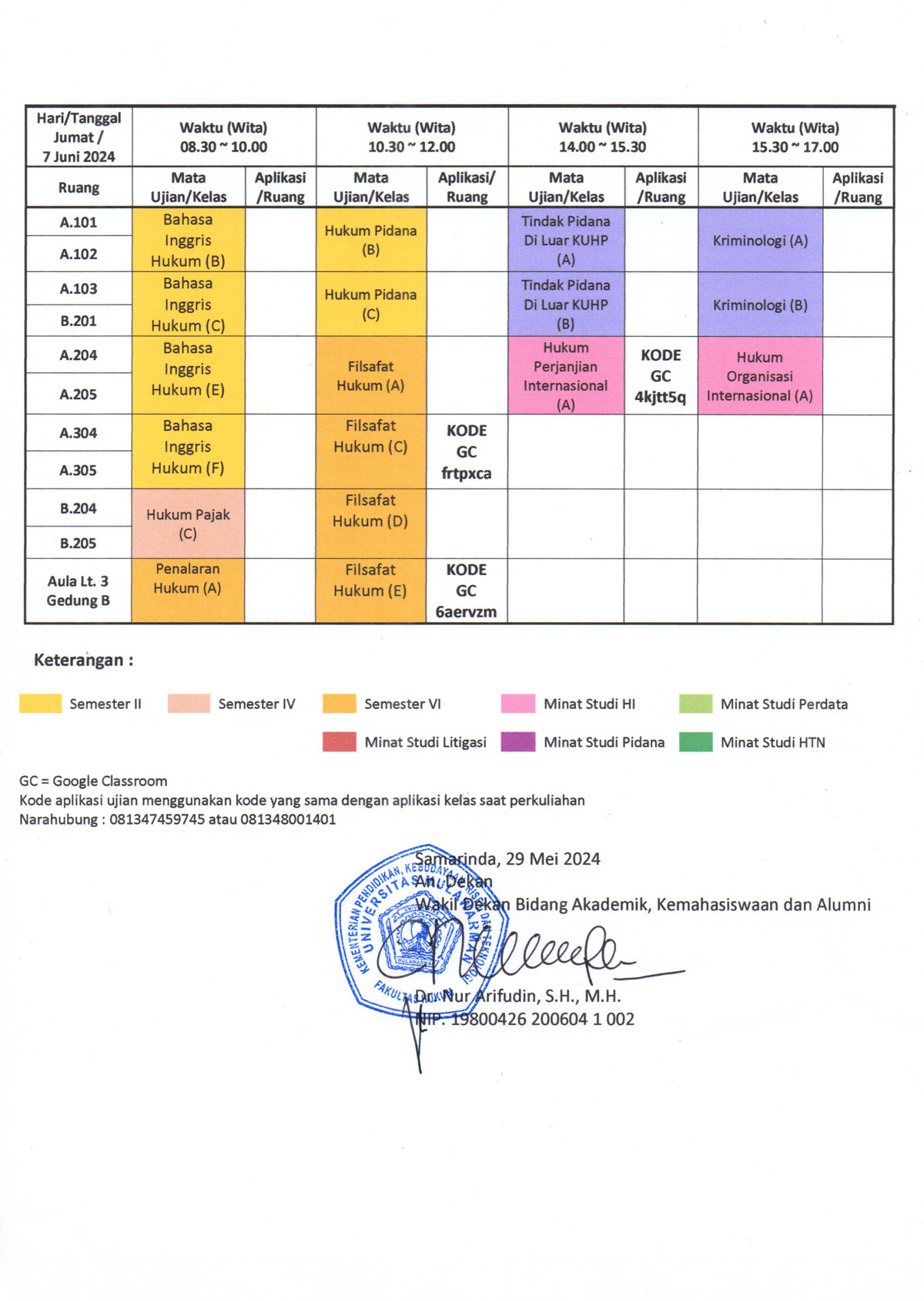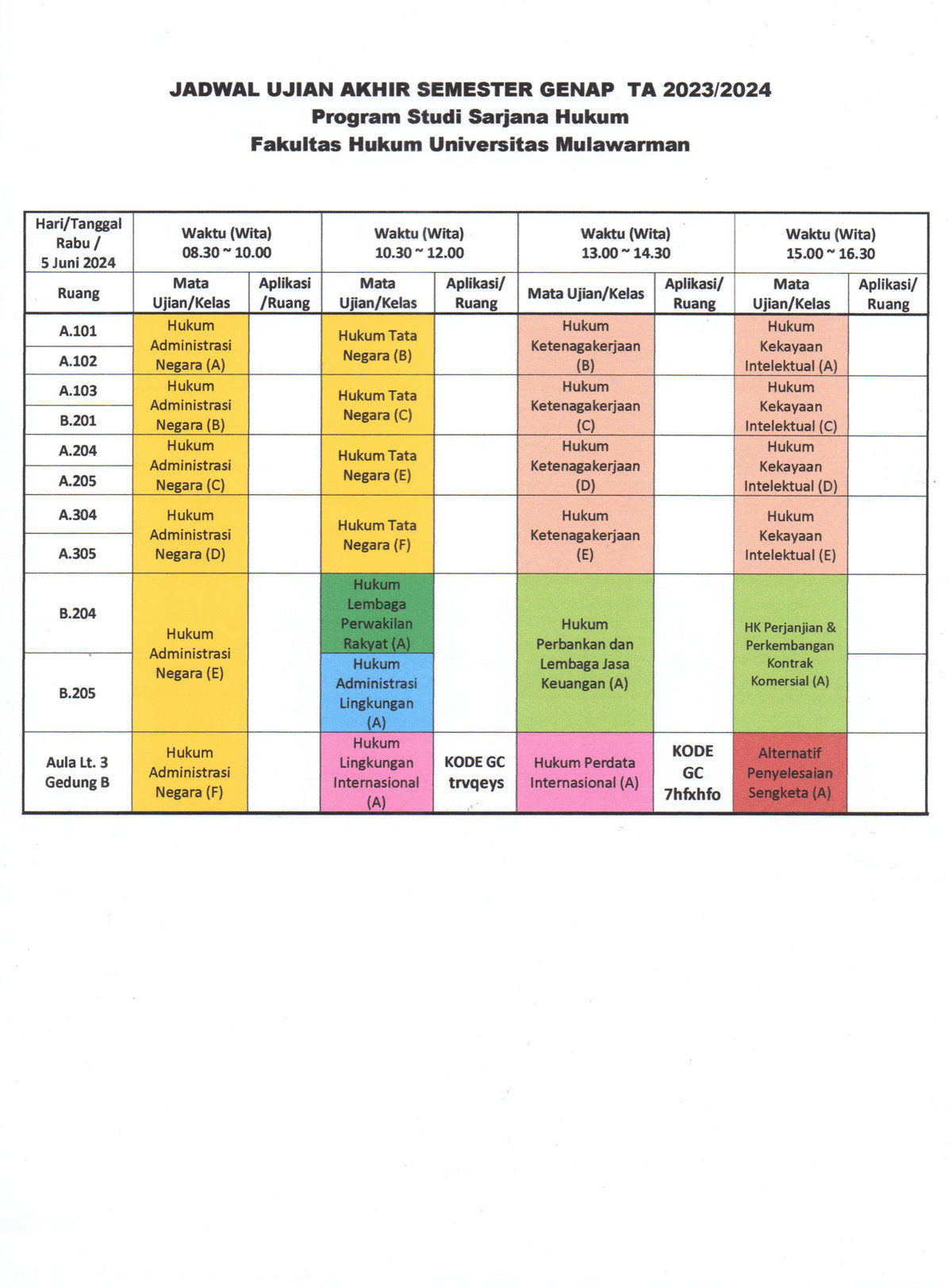 Berikut kami informasikan Jadwal Ujian Akhir Semester Genap Tahun Akademik 2023/2024 Program Studi Sarjana Hukum Fakultas Hukum Universitas Mulawarman.