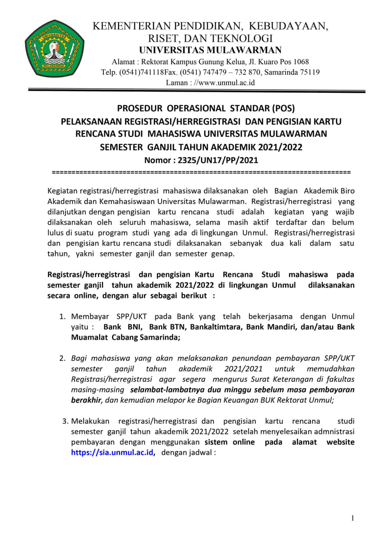 Berikut kami informasikan Prosedur Operasi Standar (POS) herregistrasi dan pengisian Kartu Rencana Studi (KRS) Semester Ganjil tahun akademik 2020/2021 Universitas Mulawarman. Kegiatan herregistrasi dilaksanakan oleh Bagian Akademik Biro Akademik dan Kemahasiswaan Universitas Mulawarman (UNMUL). Herregistrasi dan pengisian Kartu Rencana Studi adalah kegiatan yang wajib dilaksanakan oleh seluruh mahasiswa, selama masih aktif terdaftar dan belum lulus di suatu program studi yang ada di lingkungan UNMUL.