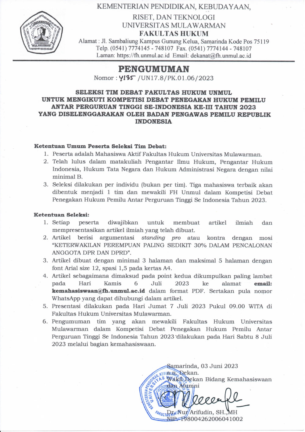 Pengumuman perihal ketentuan umum peserta dan ketentuan seleksi Tim Debat Fakultas Hukum UNMUL untuk mengikuti Kompetisi Debat Penegakan Hukum Pemilu antar Perguruan Tinggi Se-Indonesia Ke-III Tahun 2023 yang diselenggarakan oleh Badan Pengawas Pemilu Republik Indonesia.