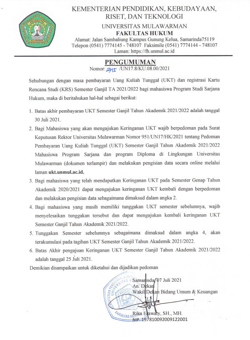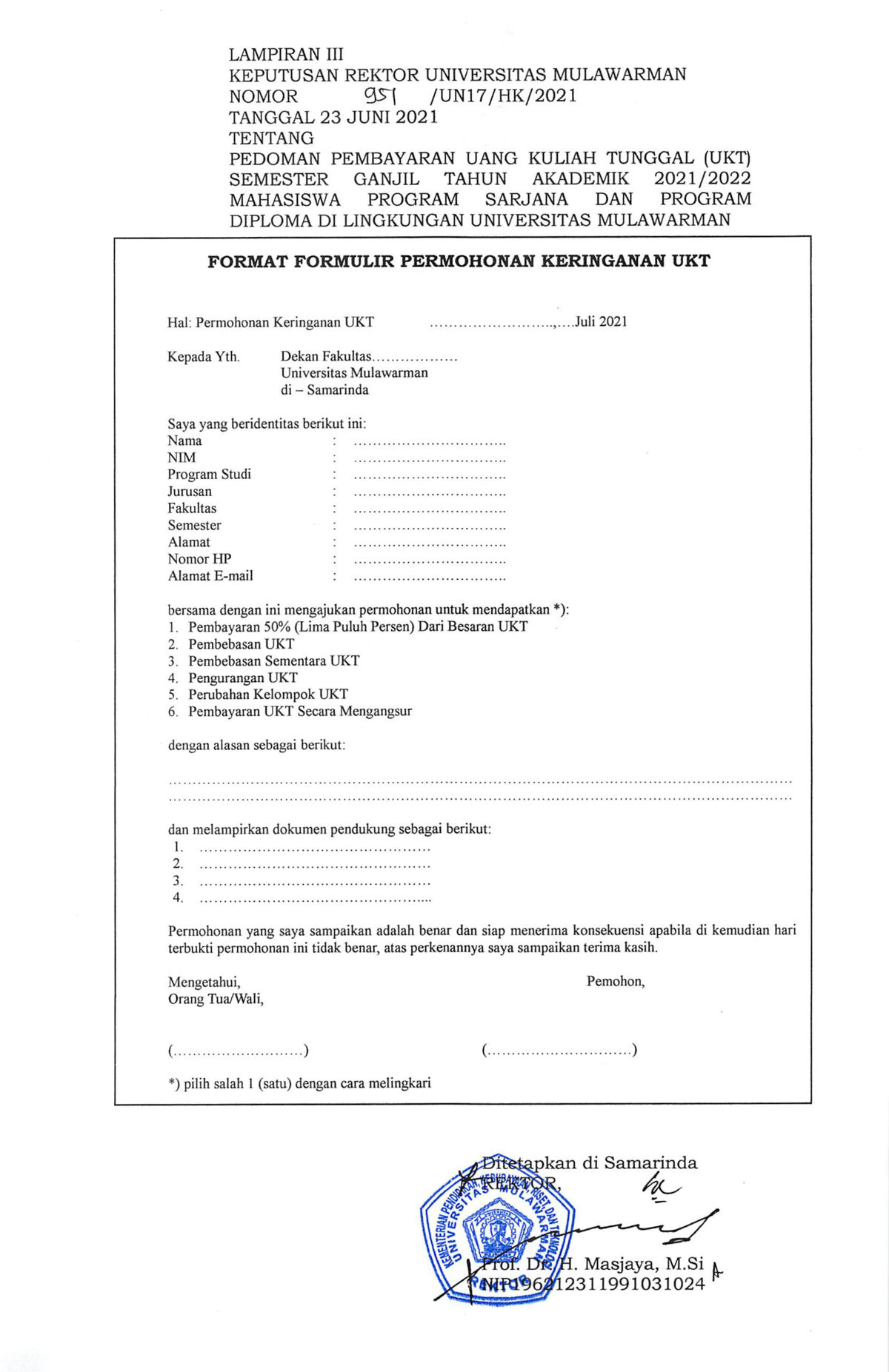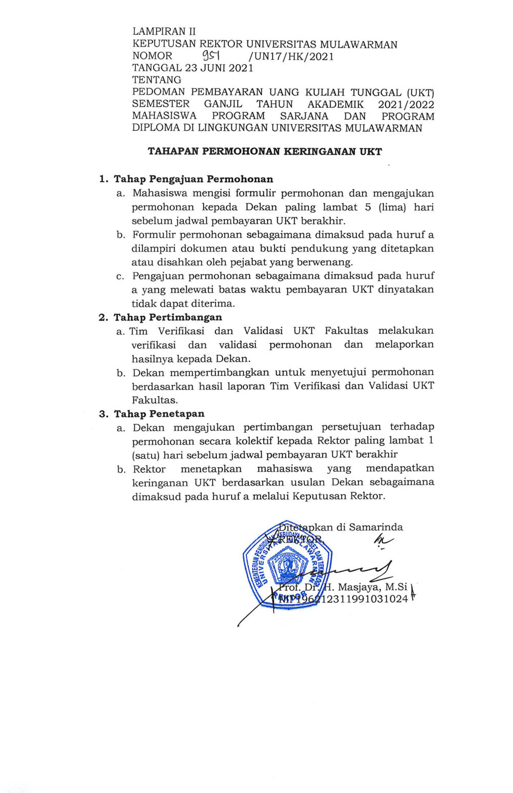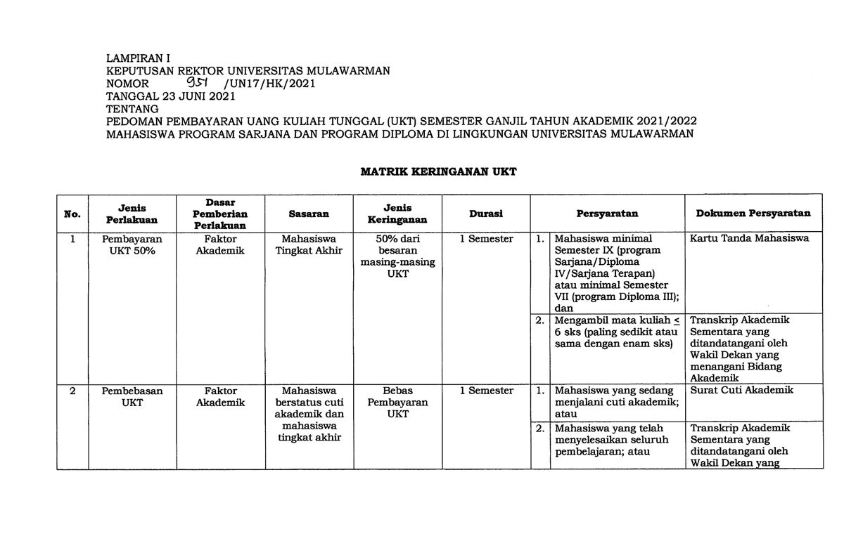 Download SK Rektor Tentang Pedoman Pembayaran Uang Kuliah Tunggal (UKT) Semester Ganjil TA 2021/2022 Program Sarjana & Program Diploma Di Lingkungan Universitas Mulawarman Klik Disini