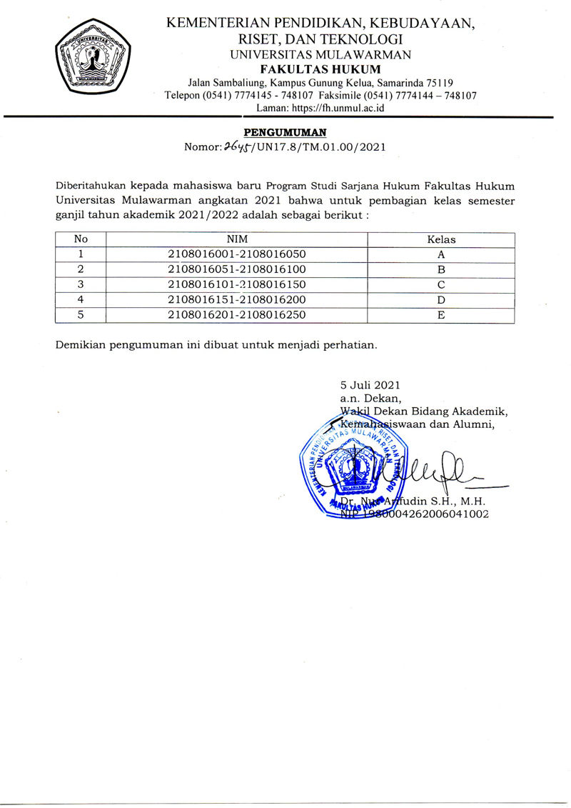 Foto 1: Pengumuman Pembagian Kelas Mahasiswa Baru Angkatan 2021 Semester Ganjil T.A. 2021/2022 Program Studi Sarjana Hukum FH UNMUL