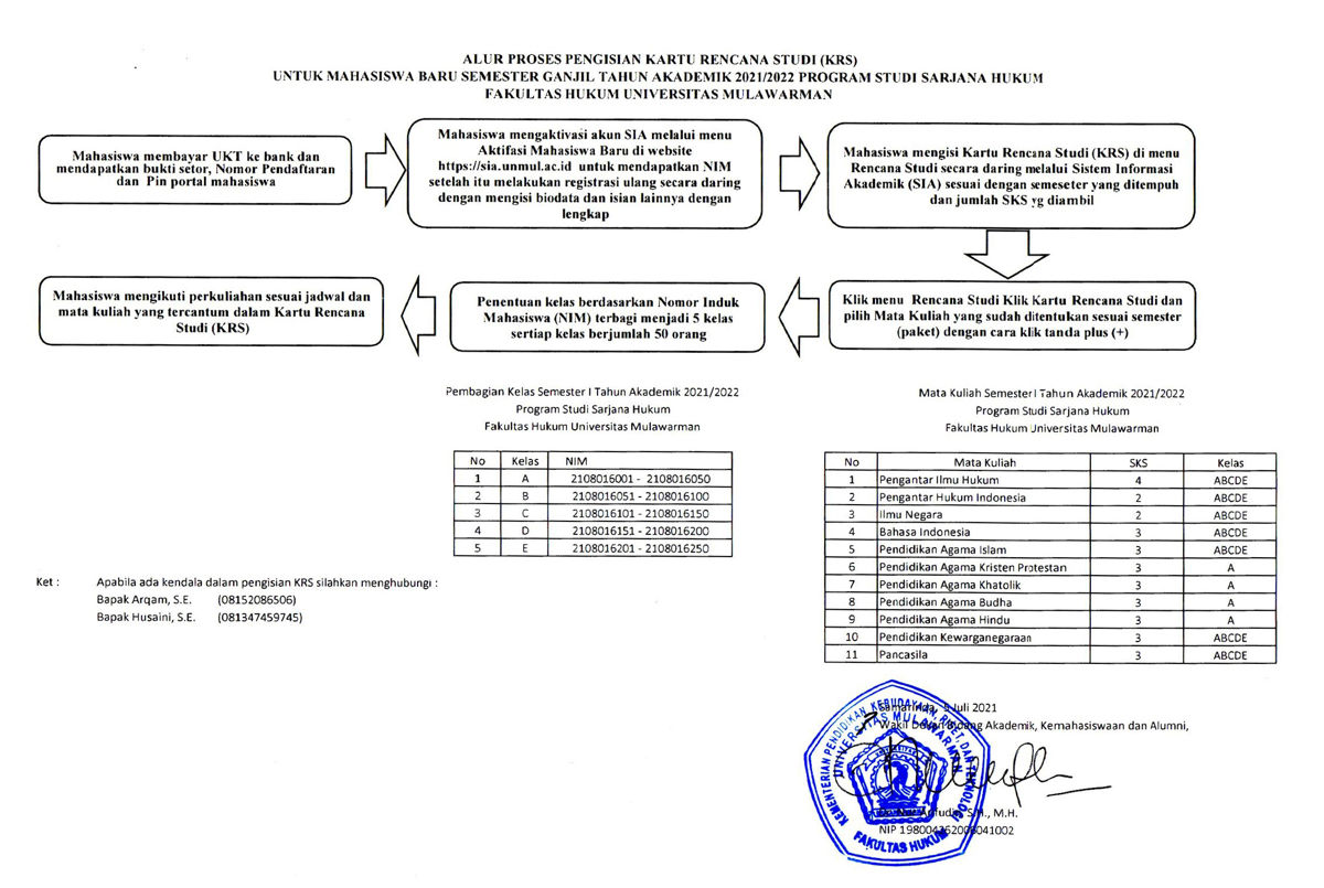 Berikut kami informasikan pembagian kelas berdasarkan NIM (Nomor Induk Mahasiswa) dan alur pengisian Kartu Rencana Studi (KRS) bagi Mahasiswa Baru Angkatan 2021 Semester Ganjil T.A. 2021/2022 Program Studi Sarjana Hukum Fakultas Hukum Universitas Mulawarman.