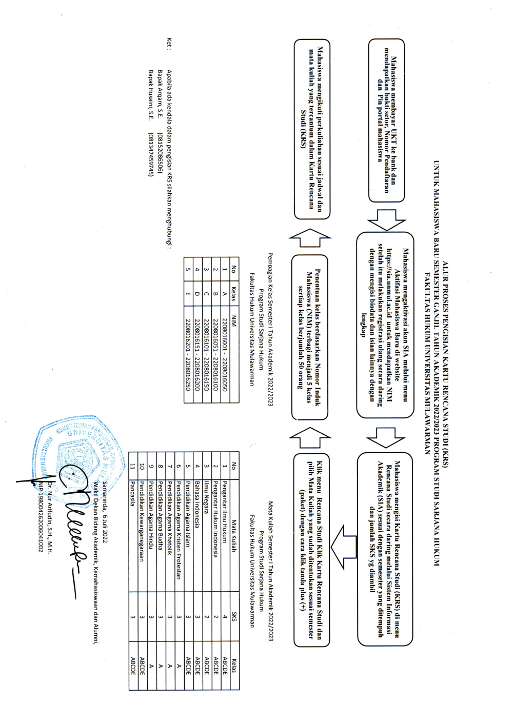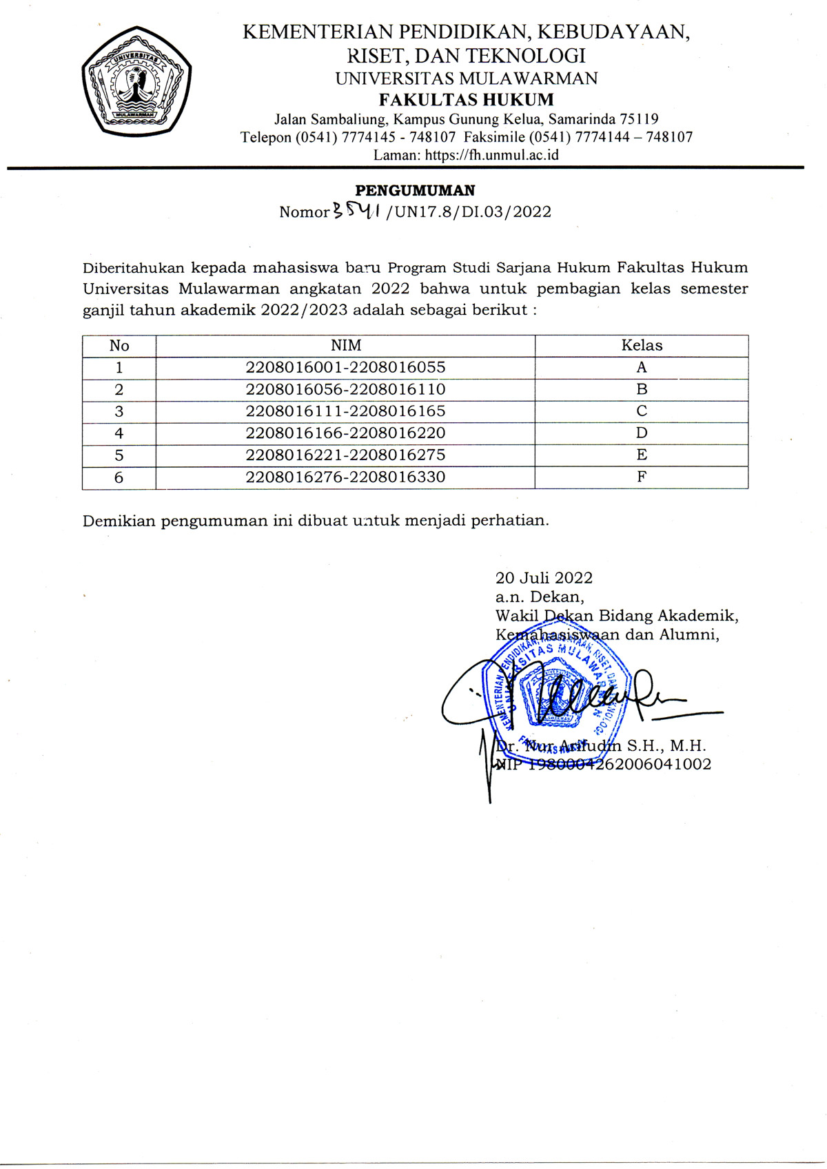 Diberitahukan kepada Mahasiswa baru Program Studi Sarjana Hukum Fakultas Hukum Universitas Mulawarman angkatan 2022 bahwa untuk pembagian kelas semester ganjil tahun akademik 2022/2023 adalah sebagai berikut: