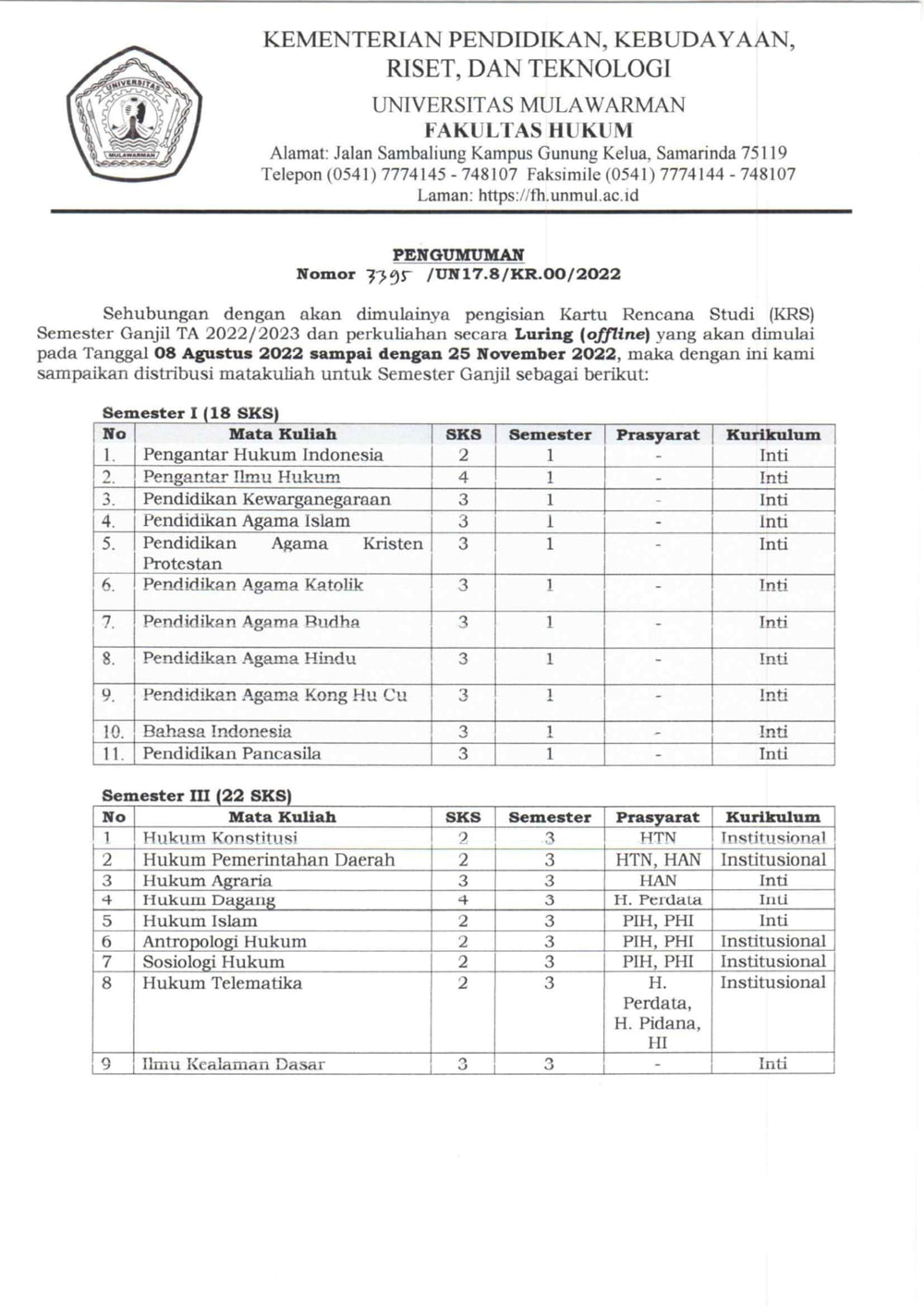 Foto 1: Lampiran Softcopy Surat Pengumuman Nomor: 3395/UN17.8/KR.00/2022 tentang Distribusi Mata Kuliah Semester Ganjil T.A. 2022/2023 Prodi Sarjana Hukum - Page 1