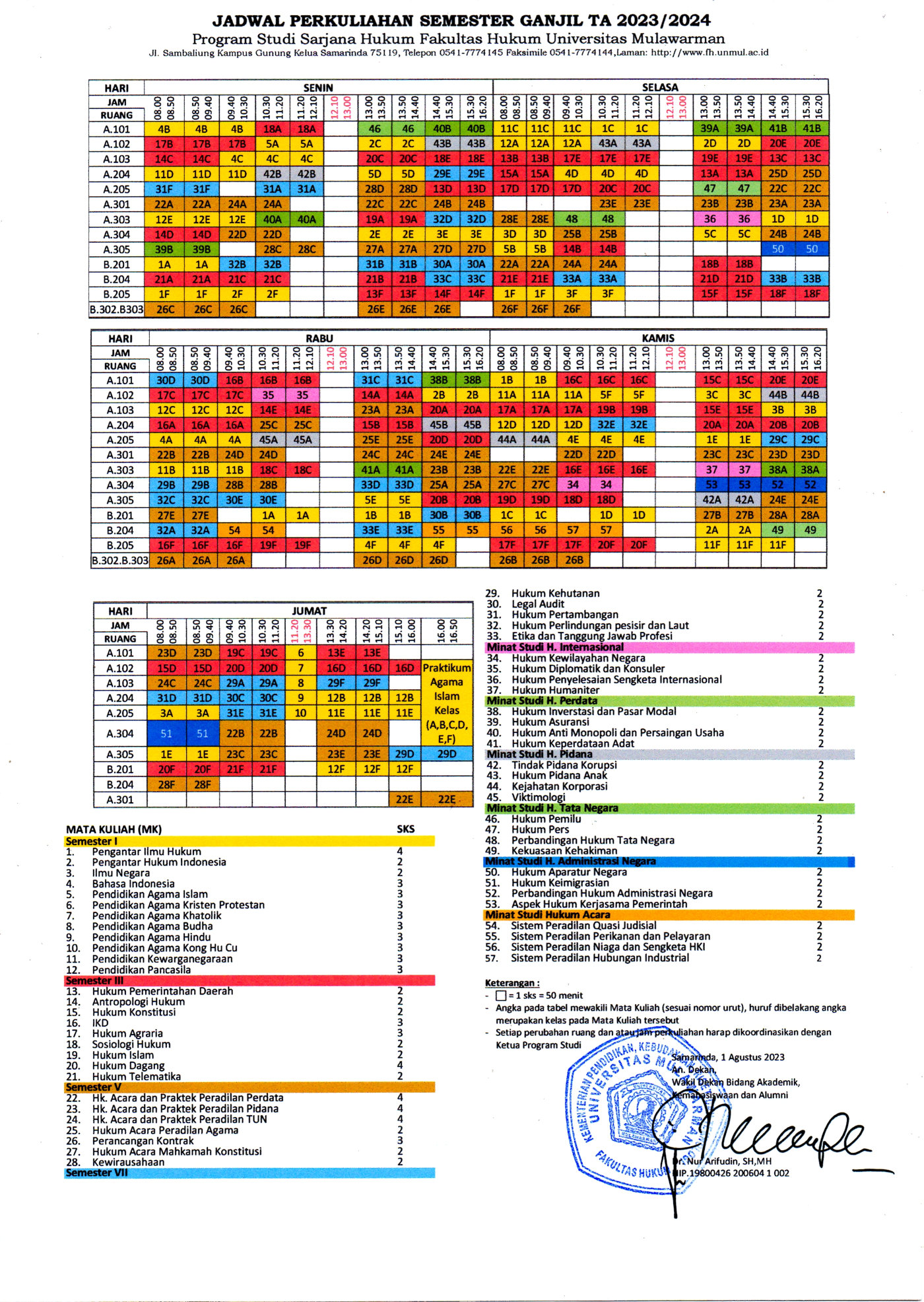 Foto 1: Lampiran Jadwal Kuliah Program Studi Sarjana Hukum FH UNMUL Semester Ganjil T.A. 2023/2024