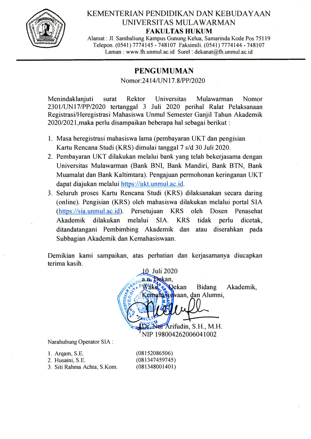 Foto 1: Surat Pengumuman Pelaksanaan Registrasi/Heregistrasi Mahasiswa Fakultas Hukum Unmul Semester Ganjil T.A. 2020/2021