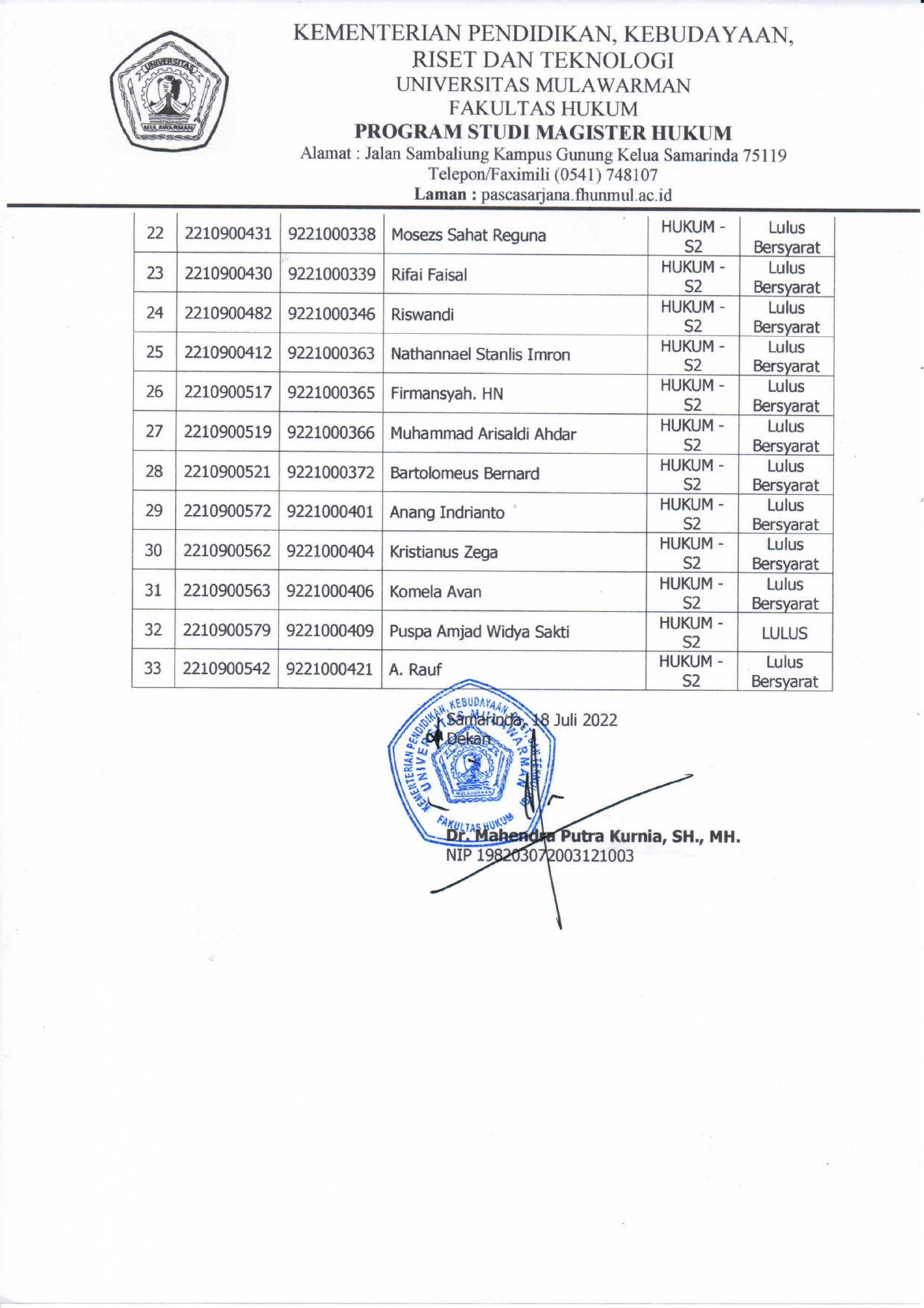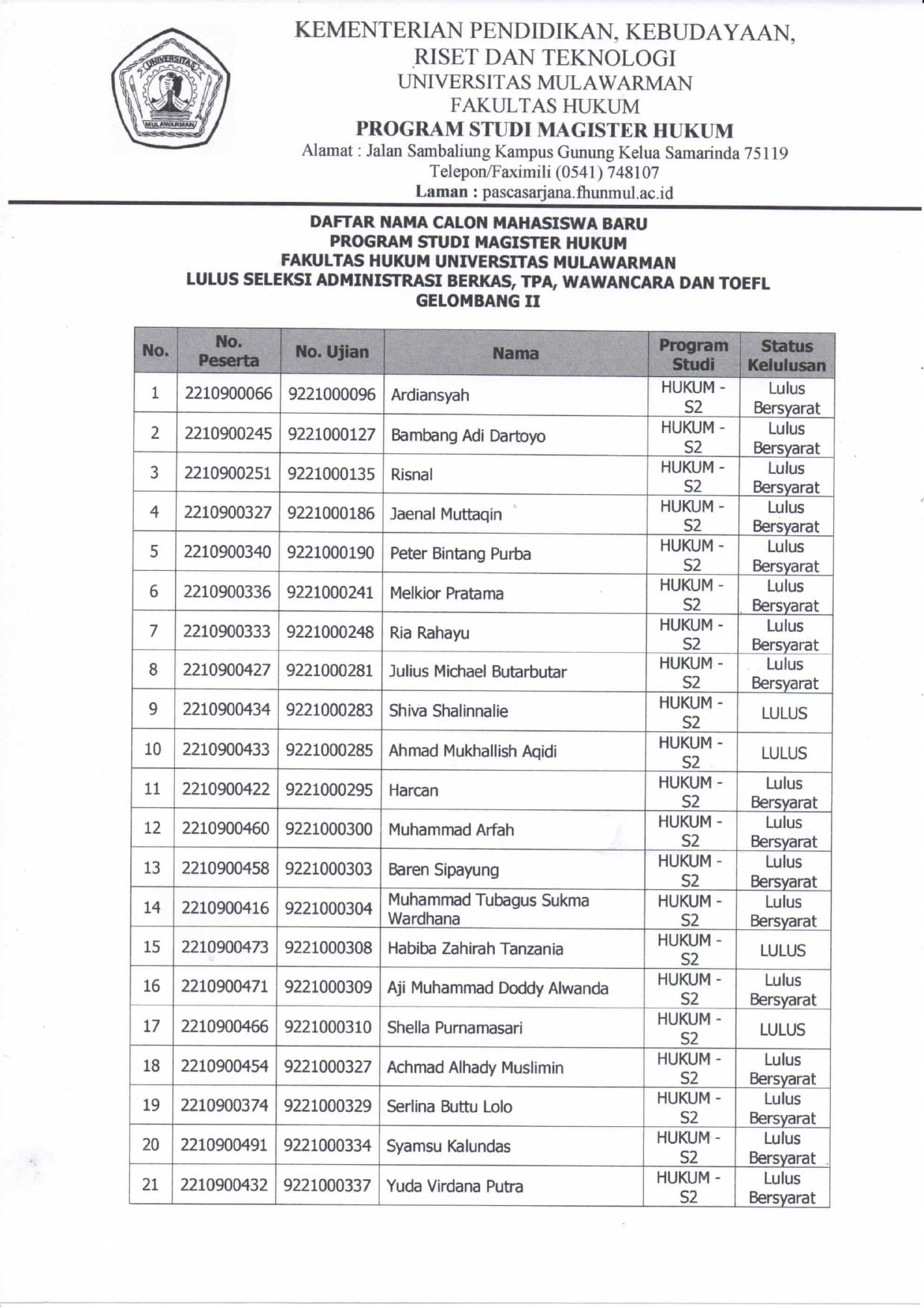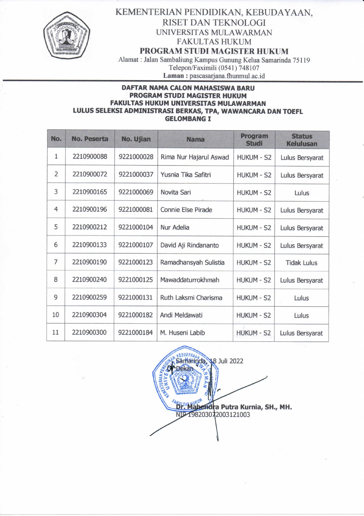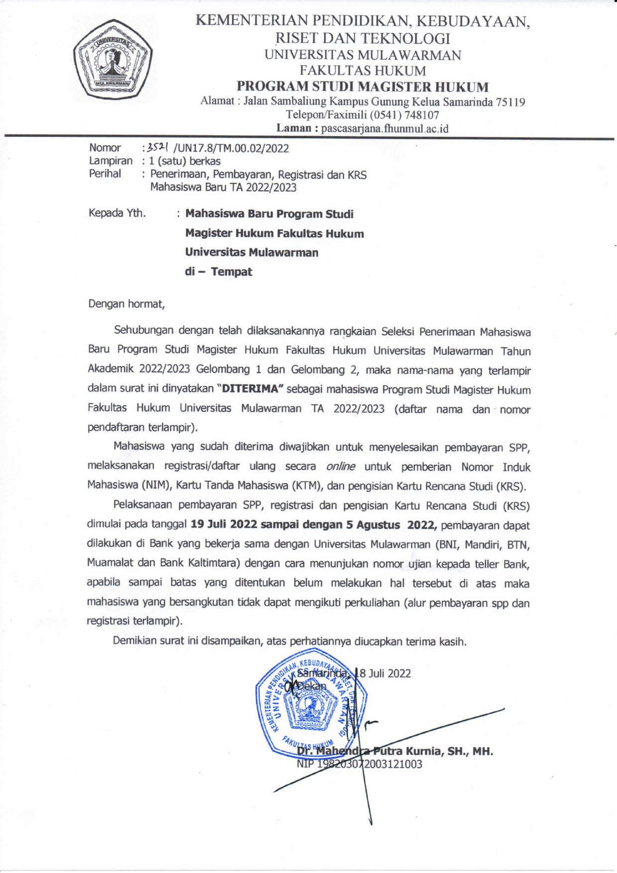 Sehubungan telah dilaksanakaannya rangkaian Seleksi Penerimaan Mahasiswa Baru Program Studi Magister Hukum Fakultas Hukum Universitas Mulawarman Tahun Akademik 2022/2023 Gelombang 1 dan Gelombang 2, maka nama-nama terlampir dalam surat ini dinyatakan "Diterima" sebagai mahasiswa Program Studi Magister Hukum Fakultas Hukum Universitas Mulawarman Tahun akademik 2022/2023.