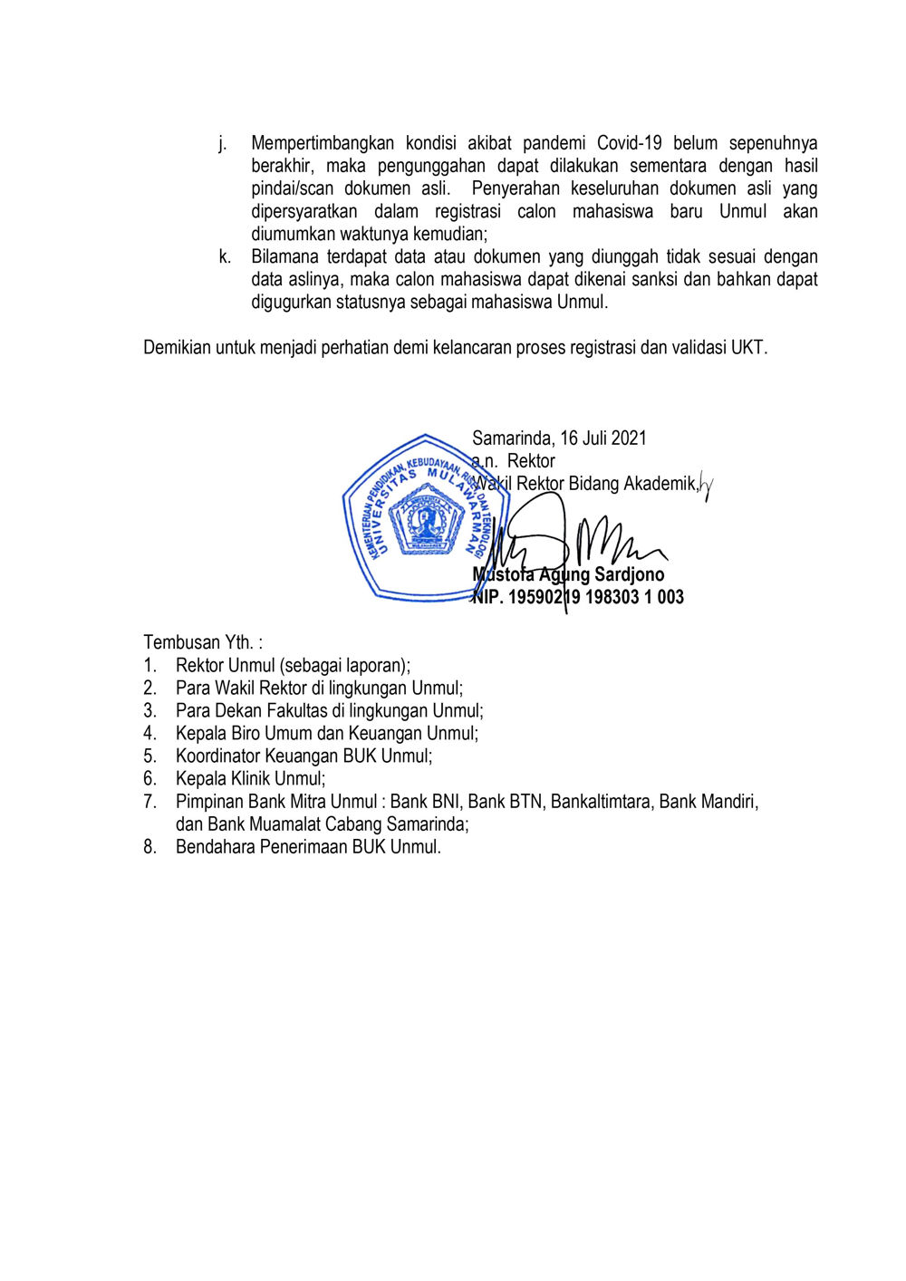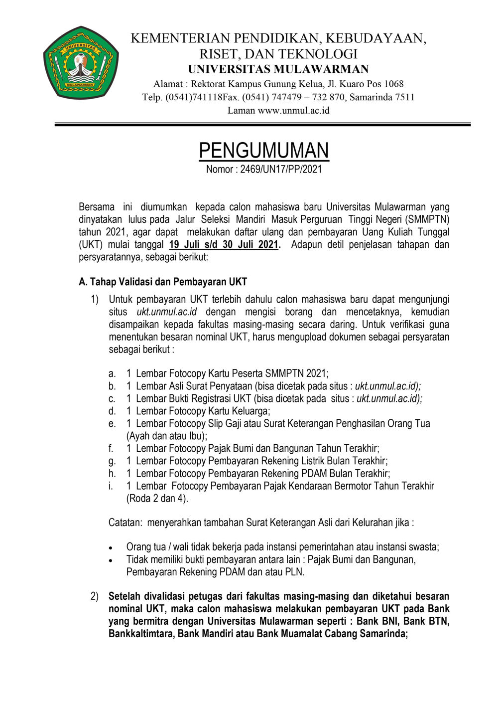 Bersama ini Kami umumkan kepada calon mahasiswa baru Universitas Mulawarman yang dinyatakan lulus pada Jalur Seleksi Mandiri Masuk Perguruan Tinggi Negeri (SMMPTN) tahun 2021 Universitas Mulawarman, agar dapat melakukan pembayaran Uang Kuliah Tunggal (UKT) dan Daftar Ulang (Registrasi) dengan jadwal sebagai berikut: