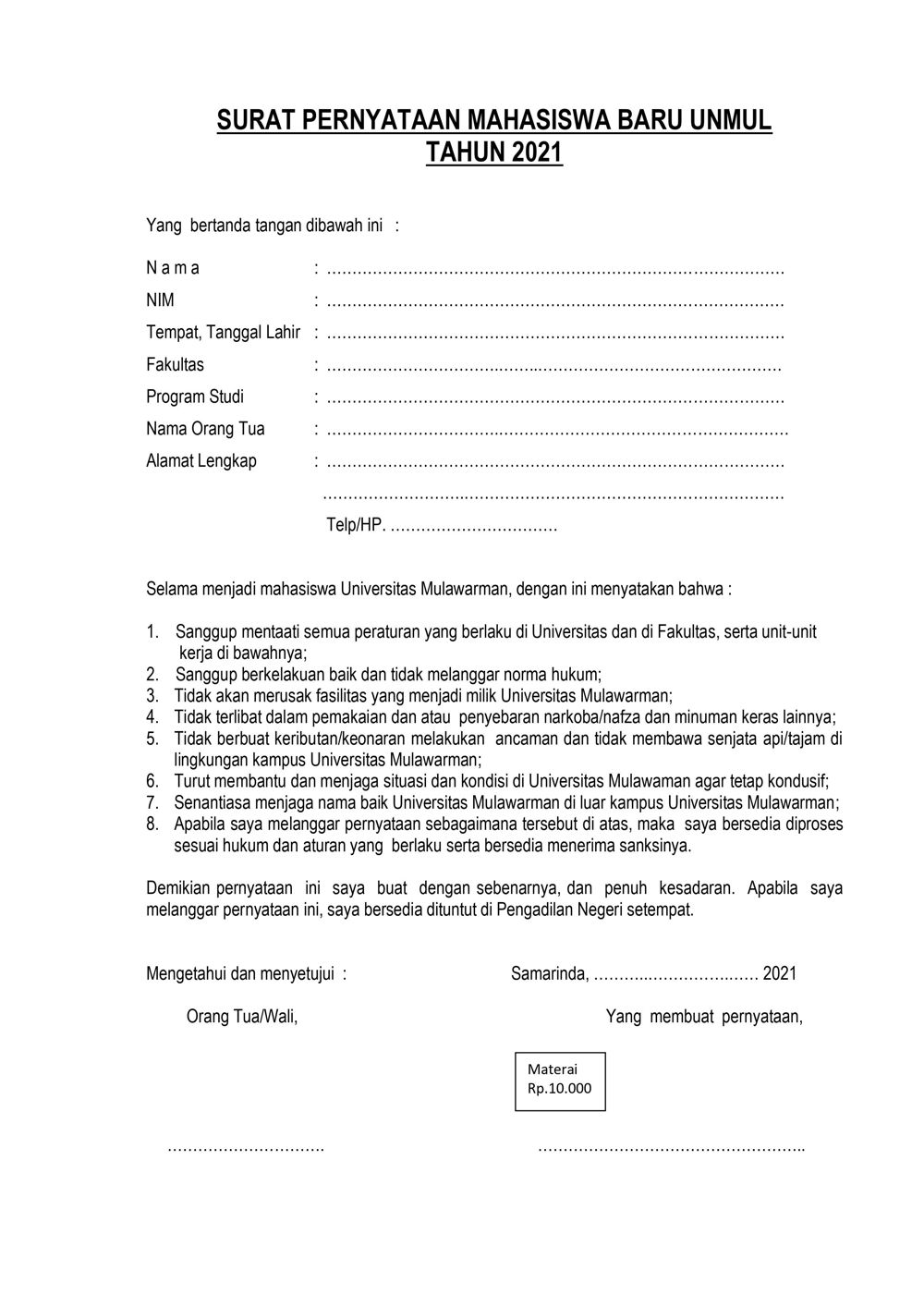 Foto 4: Lampiran - Surat pernyataan Mahasiswa Baru Unmul Tahun 2021