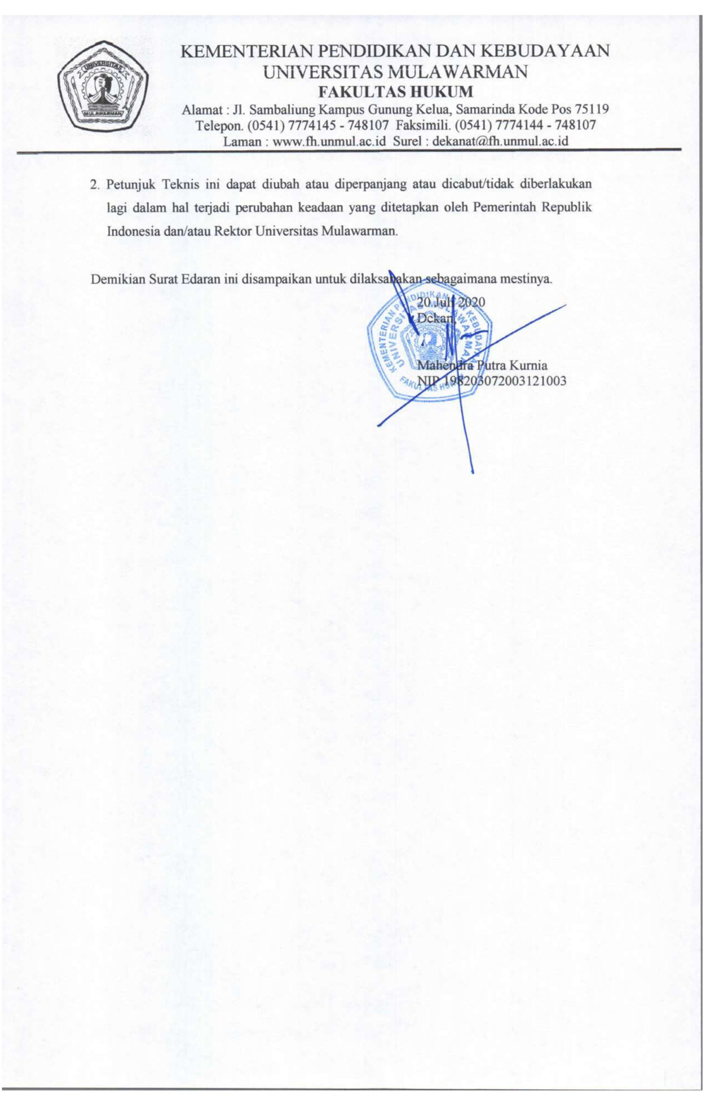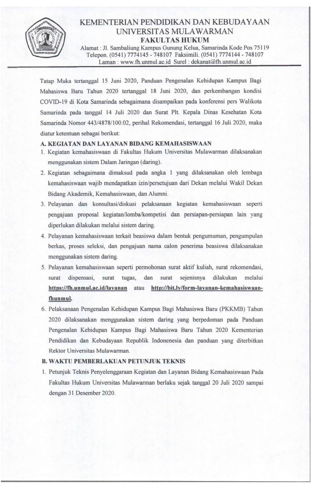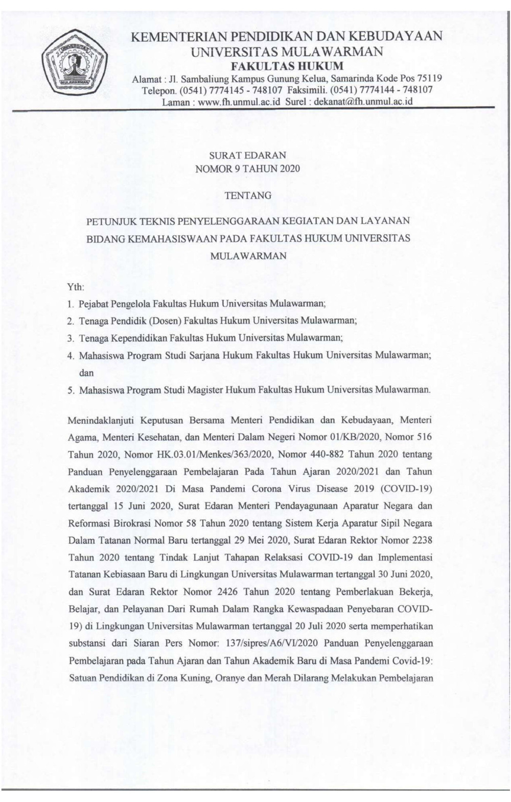 Surat Edaran Dekan Nomor 9 Tahun 2020 Tentang Petunjuk Teknis Penyelenggaraan Kegiatan dan Layanan Bidang Kemahasiswaan pada Fakultas Hukum Universitas Mulawarman