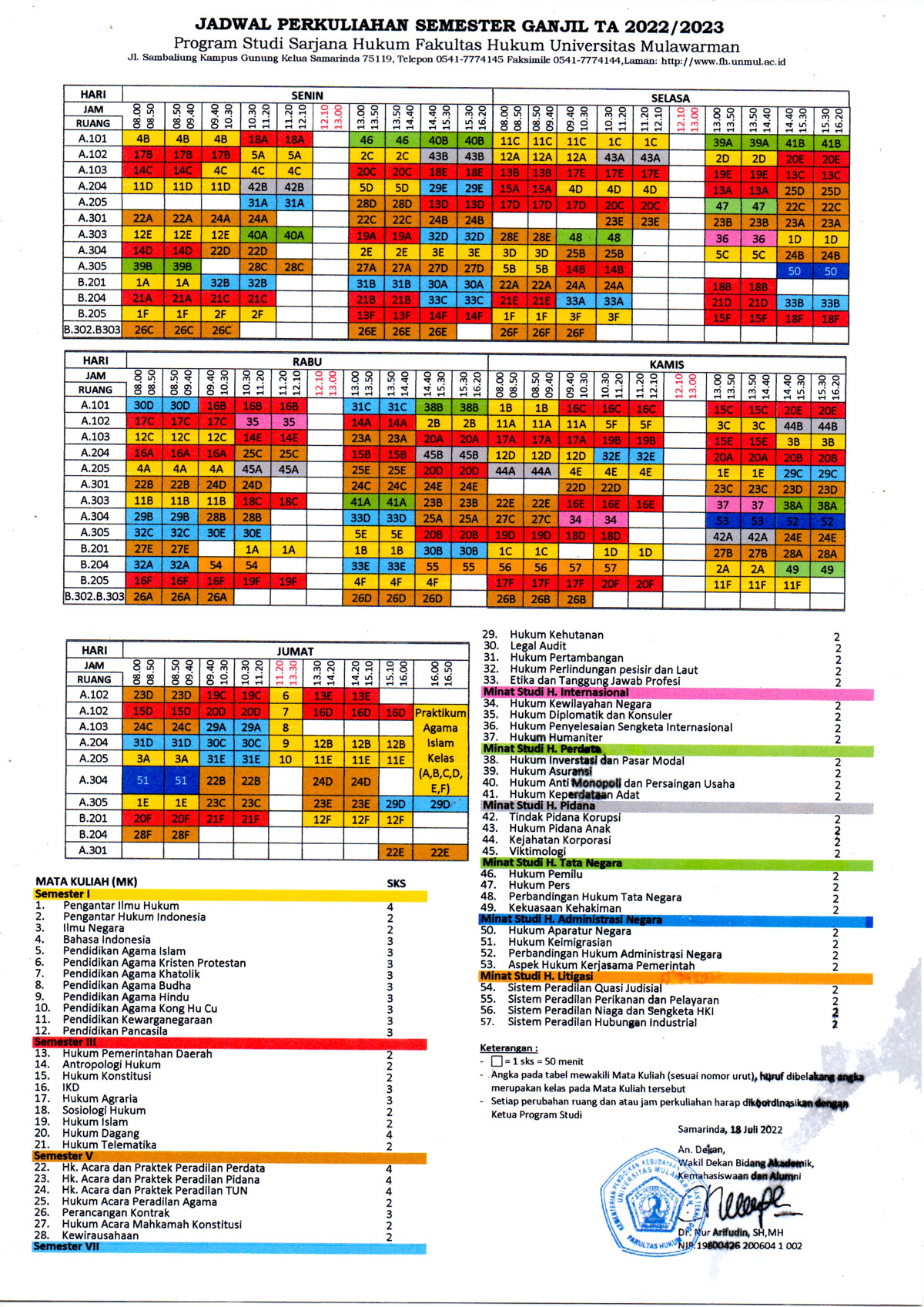 Foto 1: Lampiran Jadwal Kuliah Program Studi Sarjana Hukum FH UNMUL Semester Ganjil T.A. 2022/2023 (Update 2 Agustus 2022 Pukul 16.00 WITA)