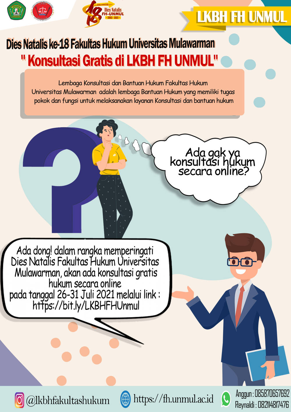 Pada Dies Natalis ke-18 Fakultas Hukum Universitas Mulawarman, Lembaga Konsultasi dan Bantuan Hukum (LKBH) Fakultas Hukum Universitas Mulawarman membuka Konsultasi Hukum Gratis untuk masyarakat umum.