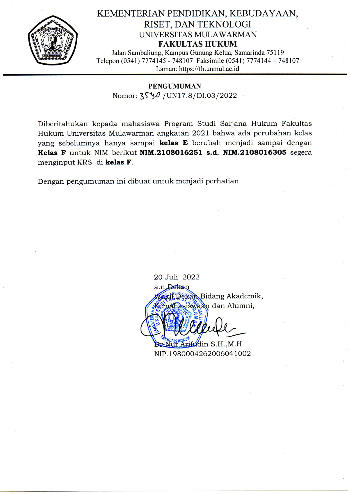 Diberitahukan kepada mahasiswa Program Studi Sarjana Hukum Fakultas Hukum Universitas Mulawarman angkatan 2021 bahwa ada perubahan kelas. Kepada NIM tertera di pengumuman harap melakukan input KRS di kelas F.