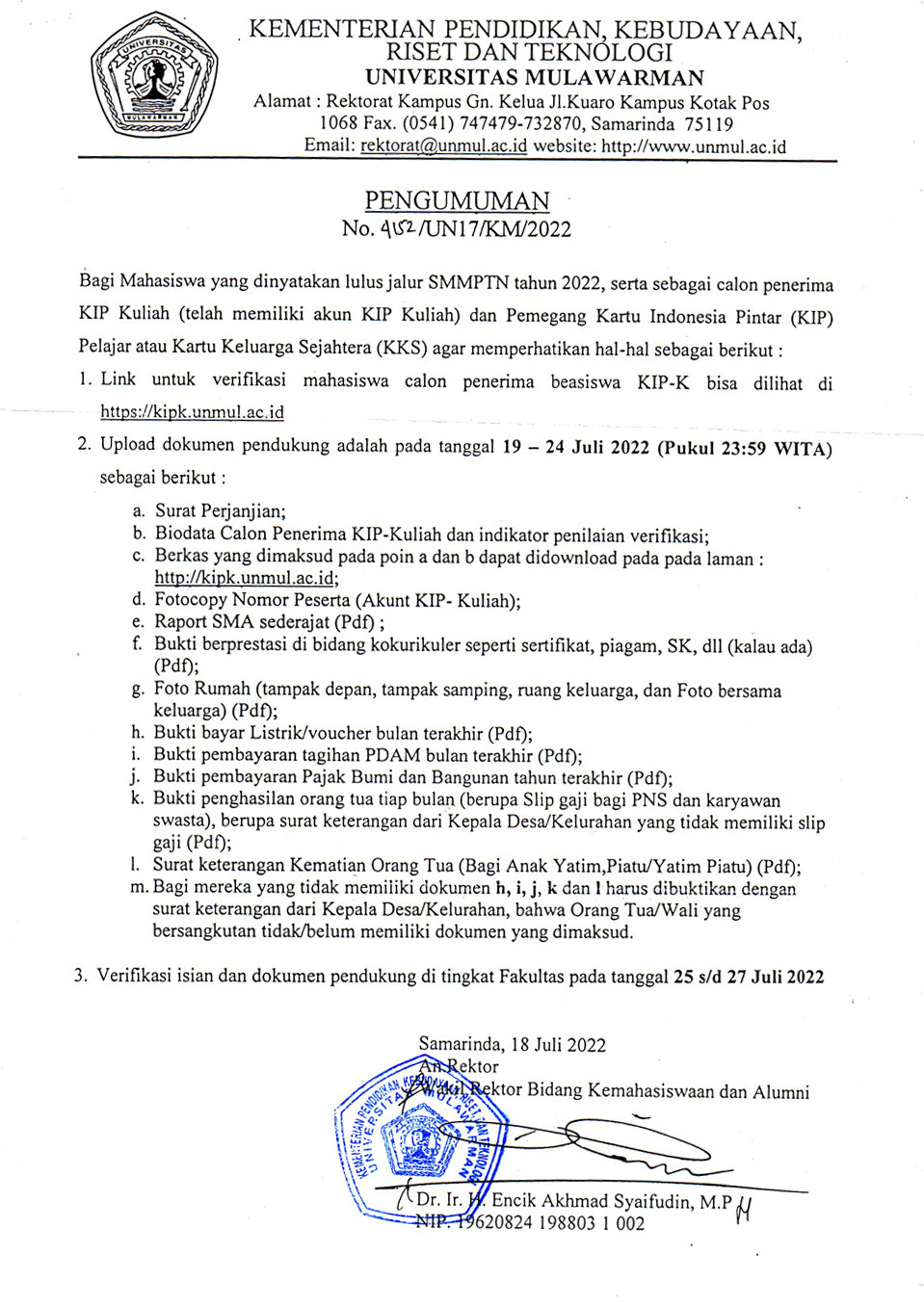 Foto 1: Pengumuman Nomor: 4152/UN17/KM/2022 perihal Pengumuman Verifikasi Calon Penerima KIP Kuliah Jalur SMMPTN tahun 2022