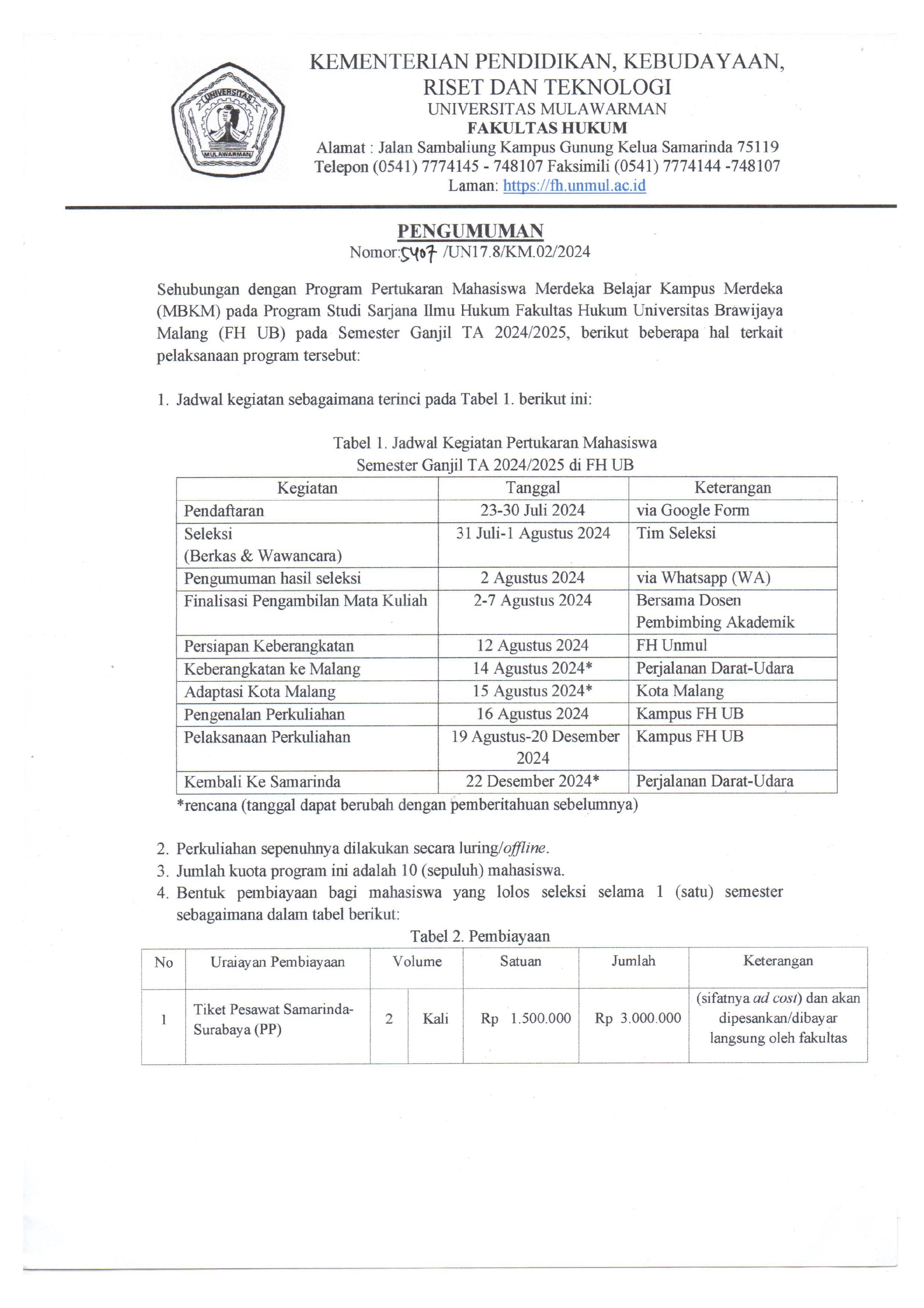 Foto 2: Pengumuman Program Pertukaran Mahasiswa MBKM Fakultas Hukum Universitas Brawijaya (FH UB) Malang Semester Ganjil TA 2024/2025 - Page 2