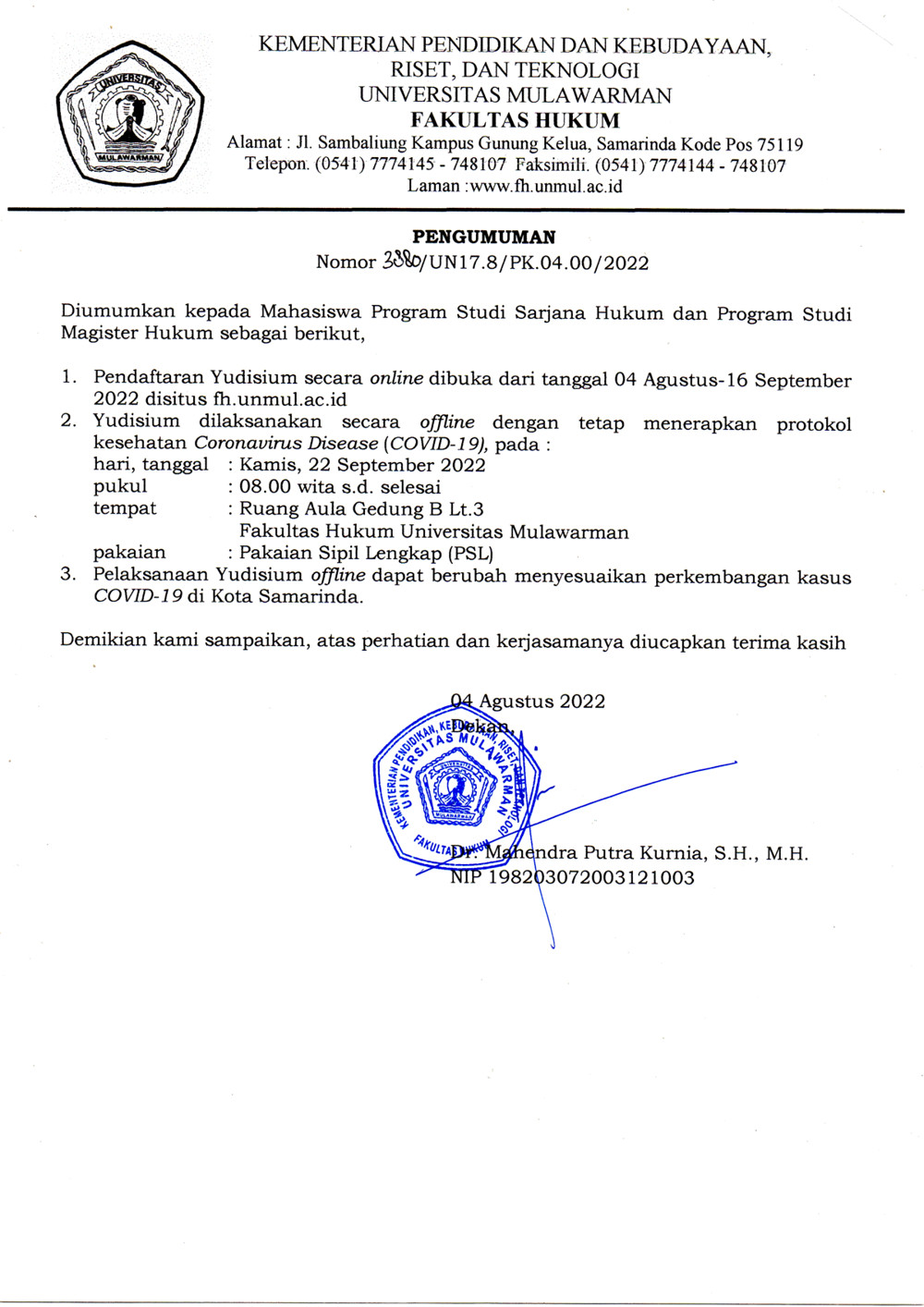 Foto 1: Surat Pengumuman Perihal Pendaftaran Yudisium Gelombang 3 Tahun 2022 Fakultas Hukum UNMUL